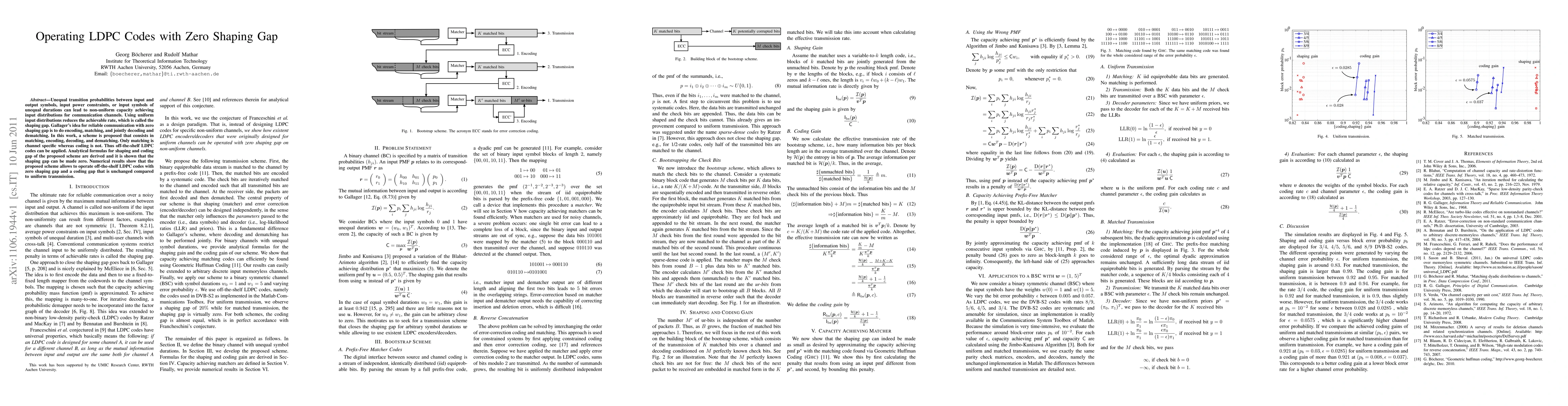 Unequal transition probabilities between input and output symbols, input power constraints, or input symbols of unequal durations can lead to non-uniform capacity achieving input distributions for communication channels. Using uniform input distributions reduces the achievable rate, which is called the shaping gap. Gallager's idea for reliable communication with zero shaping gap is to do encoding, matching, and jointly decoding and dematching. In this work, a scheme is proposed that consists in matching, encoding, decoding, and dematching. Only matching is channel specific whereas coding is not. Thus off-the-shelf LDPC codes can be applied. Analytical formulas for shaping and coding gap of the proposed scheme are derived and it is shown that the shaping gap can be made zero. Numerical results show that the proposed scheme allows to operate off-the-shelf LDPC codes with zero shaping gap and a coding gap that is unchanged compared to uniform transmission.