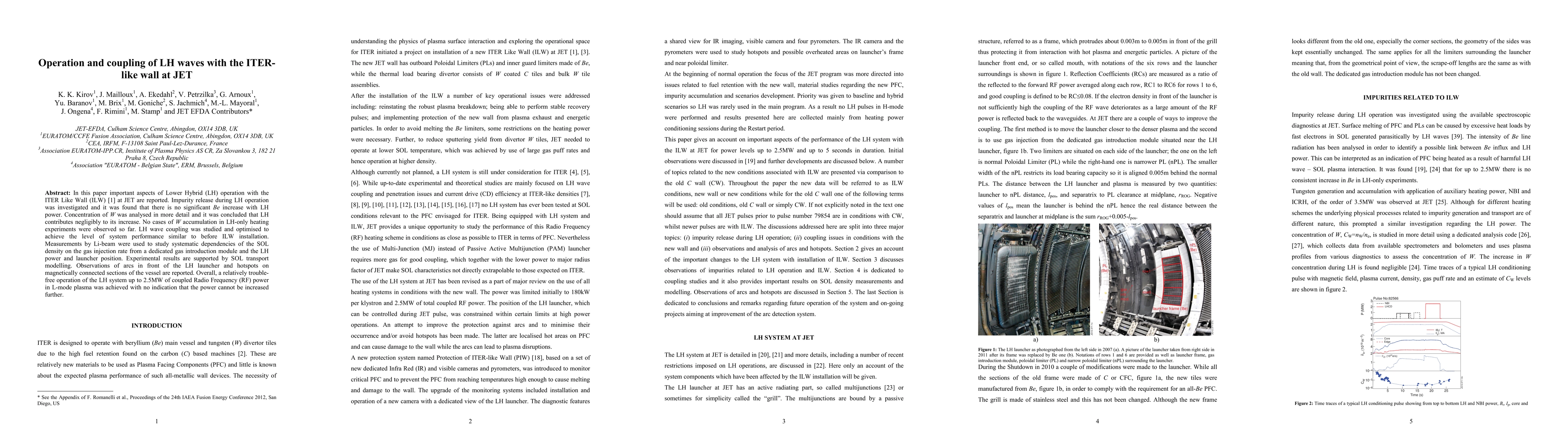 This paper investigates the operation and coupling of Lower Hybrid (LH) waves with the ITER-Like Wall at JET, finding that LH heating does not significantly increase beryllium levels or contribute to tungsten accumulation. The LH wave coupling was optimized to maintain performance levels pre-ILW installation, with no observed issues up to 2.5MW of RF power.