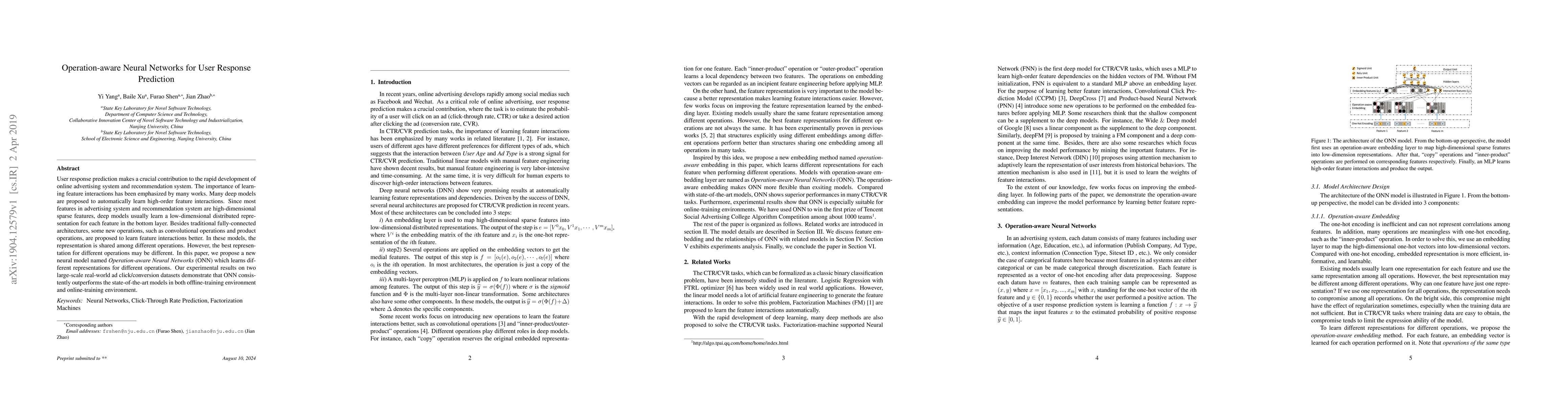 User response prediction makes a crucial contribution to the rapid development of online advertising system and recommendation system. The importance of learning feature interactions has been emphasized by many works. Many deep models are proposed to automatically learn high-order feature interactions. Since most features in advertising system and recommendation system are high-dimensional sparse features, deep models usually learn a low-dimensional distributed representation for each feature in the bottom layer. Besides traditional fully-connected architectures, some new operations, such as convolutional operations and product operations, are proposed to learn feature interactions better. In these models, the representation is shared among different operations. However, the best representation for different operations may be different. In this paper, we propose a new neural model named Operation-aware Neural Networks (ONN) which learns different representations for different operations. Our experimental results on two large-scale real-world ad click/conversion datasets demonstrate that ONN consistently outperforms the state-of-the-art models in both offline-training environment and online-training environment.