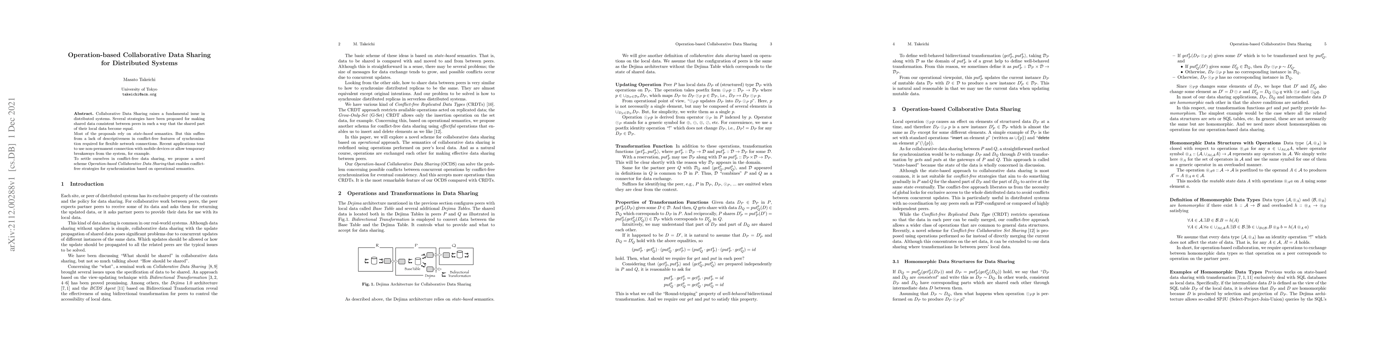This paper proposes an "Operation-based Collaborative Data Sharing" scheme for distributed systems to ensure conflict-free data consistency without relying on state-based semantics, addressing the challenges of temporary network disconnections and mobile devices. The approach leverages operational semantics for more flexible synchronization.