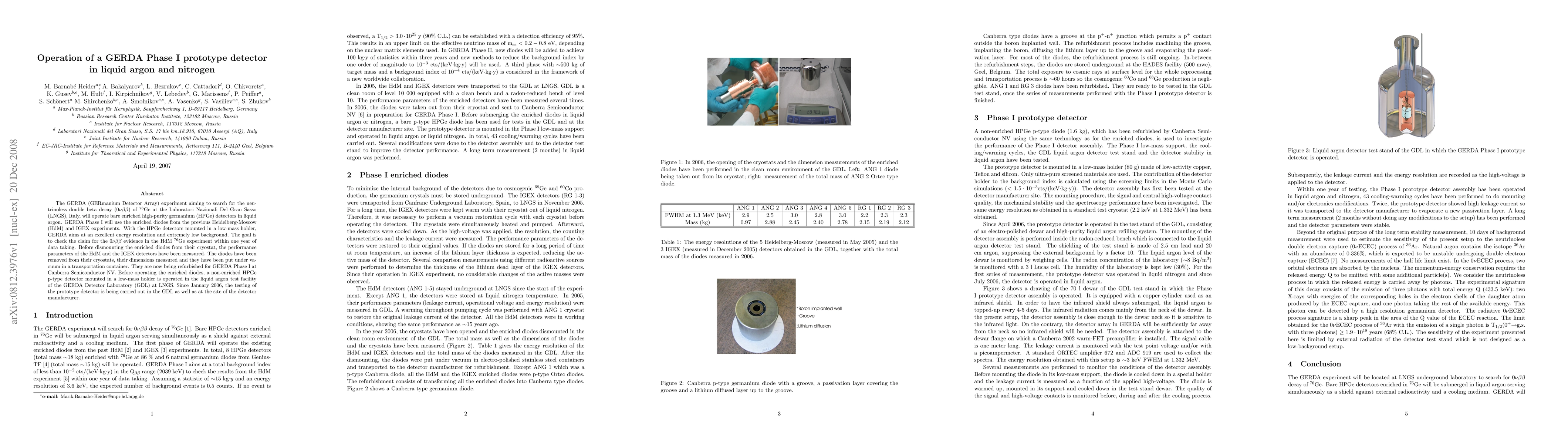 The GERDA Phase I prototype detector, operating in liquid argon and nitrogen, tests enriched germanium diodes for the neutrinoless double beta decay search. Preliminary tests on a non-enriched detector aim to achieve excellent energy resolution and low background, with the goal of verifying previous decay evidence within a year.