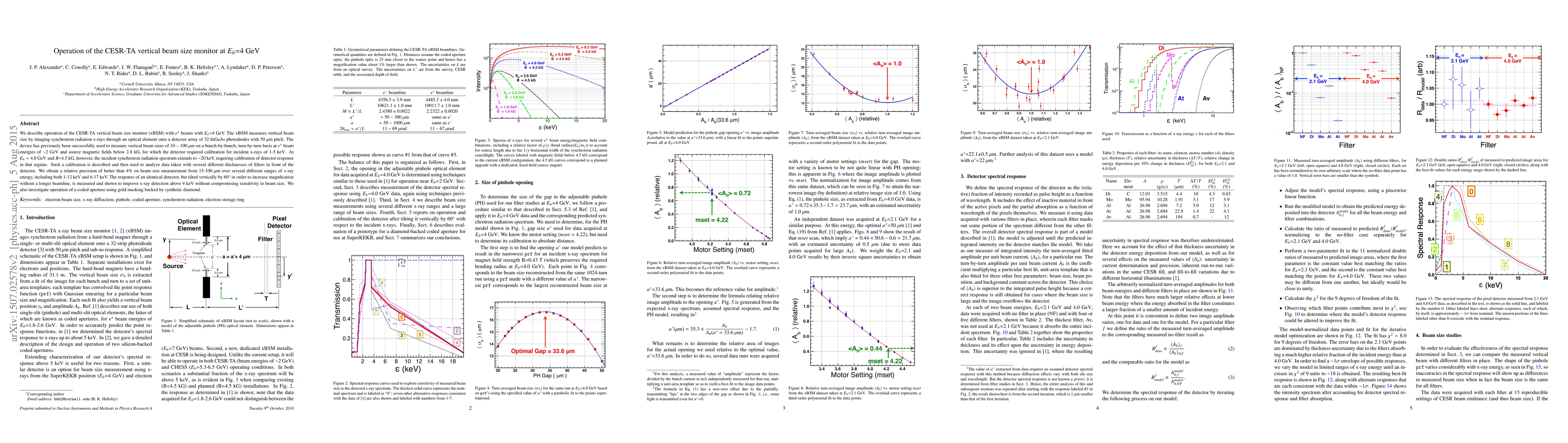 We describe operation of the CESR-TA vertical beam size monitor (xBSM) with $e^\pm$ beams with $E_{\rm b}$=4 GeV. The xBSM measures vertical beam size by imaging synchrotron radiation x-rays through an optical element onto a detector array of 32 InGaAs photodiodes with 50 $\mu$m pitch. The device has previously been successfully used to measure vertical beam sizes of 10-100 $\mu$m on a bunch-by-bunch, turn-by-turn basis at $e^\pm$ beam energies of $\sim$2 GeV and source magnetic fields below 2.8 kG, for which the detector required calibration for incident x-rays of 1-5 keV. At $E_{\rm b}=4.0$ GeV and $B$=4.5 kG, however, the incident synchrotron radiation spectrum extends to $\sim$20 keV, requiring calibration of detector response in that regime. Such a calibration is described and then used to analyze data taken with several different thicknesses of filters in front of the detector. We obtain a relative precision of better than 4% on beam size measurement from 15-100 $\mu$m over several different ranges of x-ray energy, including both 1-12 keV and 6-17 keV. The response of an identical detector, but tilted vertically by 60$^\circ$ in order to increase magnfication without a longer beamline, is measured and shown to improve x-ray detection above 4 keV without compromising sensitivity to beam size. We also investigate operation of a coded aperture using gold masking backed by synthetic diamond.