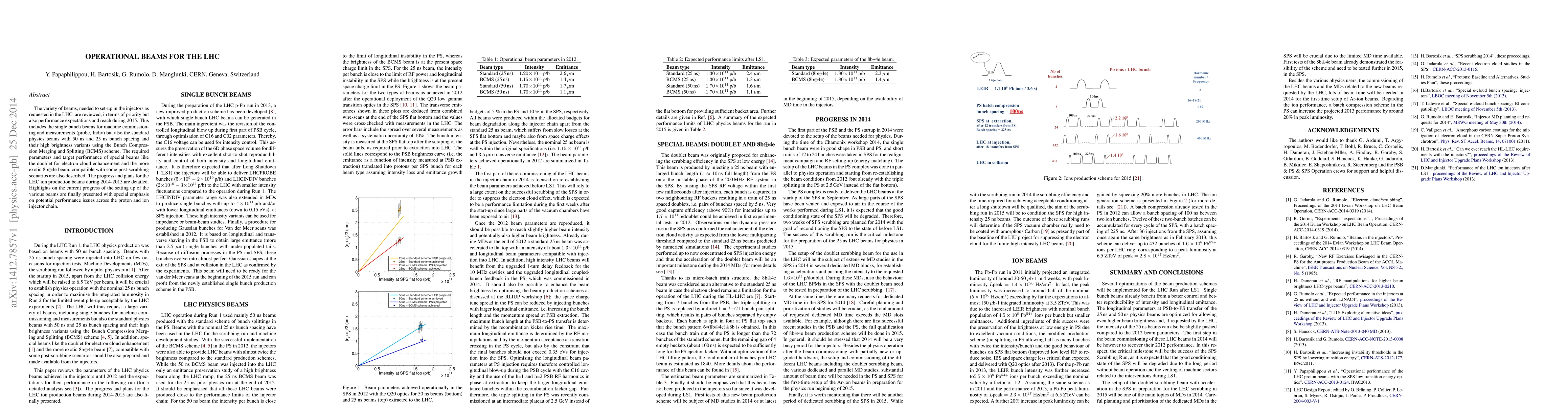 The paper reviews the various beams required for LHC setup, focusing on their priorities, performance expectations, and reach during 2015. It covers single-bunch beams for commissioning, standard physics beams with 50 ns and 25 ns bunch spacing, and their high-brightness variants using the BCMS scheme. Special beams like the doublet for electron cloud enhancement and the 8b⊕4e beam are also discussed.