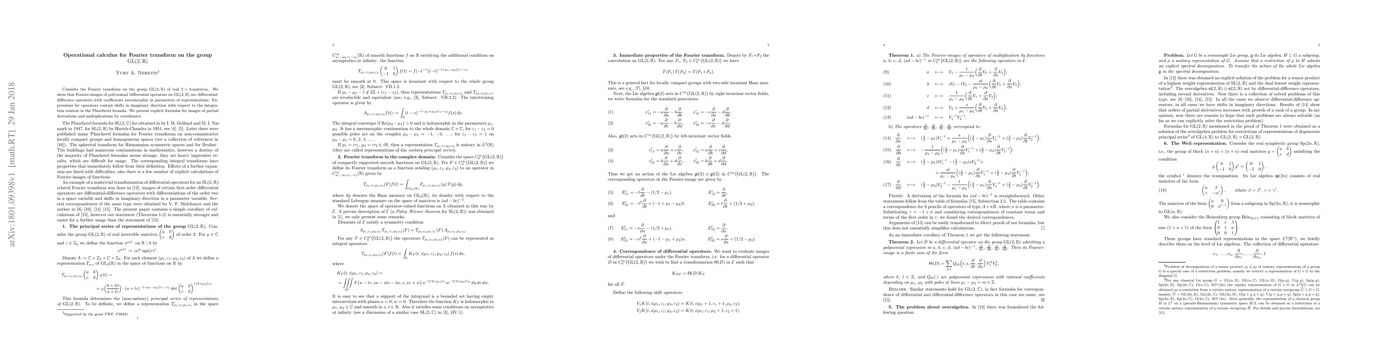 This paper introduces operational calculus for Fourier transform on GL(2,R), showing that polynomial differential operators have meromorphic coefficients in representations, and providing explicit formulas for images of partial derivations and multiplications by coordinates.