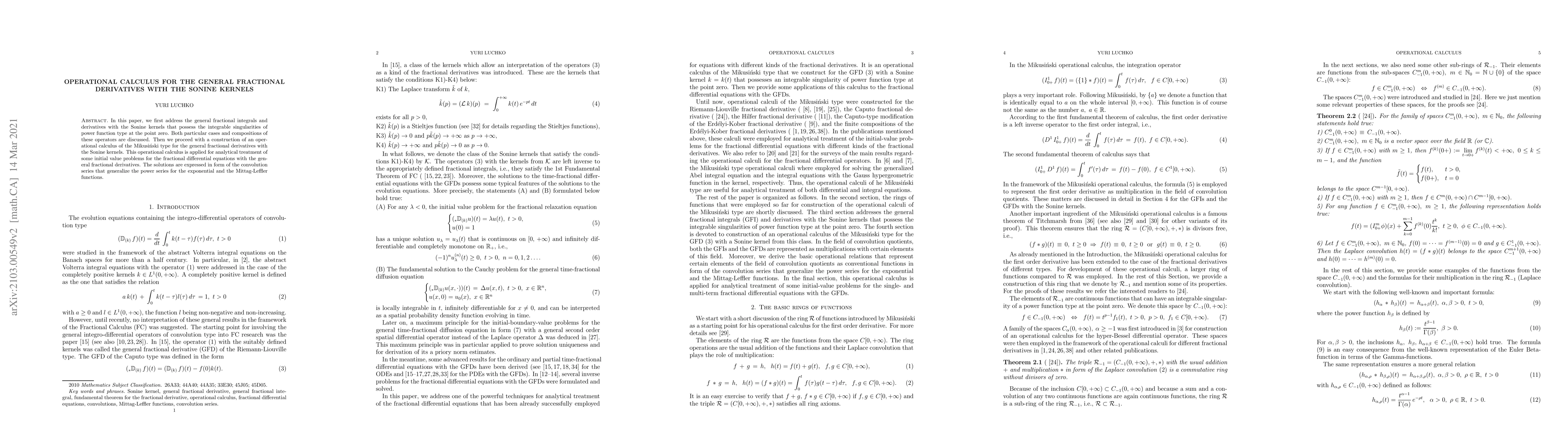 This paper develops an operational calculus for general fractional derivatives using Sonine kernels, addressing both integrals and derivatives with integrable singularities. It constructs a Mikusiński-type operational calculus applied to solve initial value problems for fractional differential equations, yielding solutions in a generalized convolution series form.
