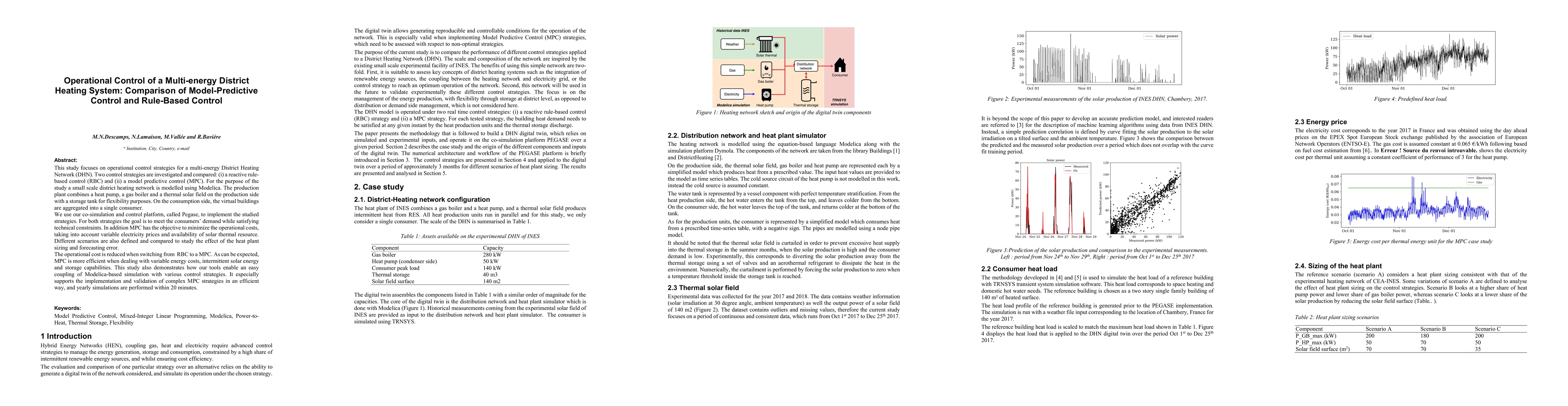 This study focuses on operational control strategies for a multi-energy District Heating Network (DHN). Two control strategies are investigated and compared: (i) a reactive rule-based control (RBC) and (ii) a model predictive control (MPC). For the purpose of the study a small scale district heating network is modelled using Modelica. The production plant combines a heat pump, a gas boiler and a thermal solar field on the production side with a storage tank for flexibility purposes. On the consumption side, the virtual buildings are aggregated into a single consumer. We use our co-simulation and control platform, called Pegase, to implement the studied strategies. For both strategies the goal is to meet the consumers' demand while satisfying technical constraints. In addition MPC has the objective to minimize the operational costs, taking into account variable electricity prices and availability of solar thermal resource. Different scenarios are also defined and compared to study the effect of the heat plant sizing and forecasting error. The operational cost is reduced when switching from RBC to a MPC. As can be expected, MPC is more efficient when dealing with variable energy costs, intermittent solar energy and storage capabilities. This study also demonstrates how our tools enable an easy coupling of Modelica-based simulation with various control strategies. It especially supports the implementation and validation of complex MPC strategies in an efficient way, and yearly simulations are performed within 20 minutes.
