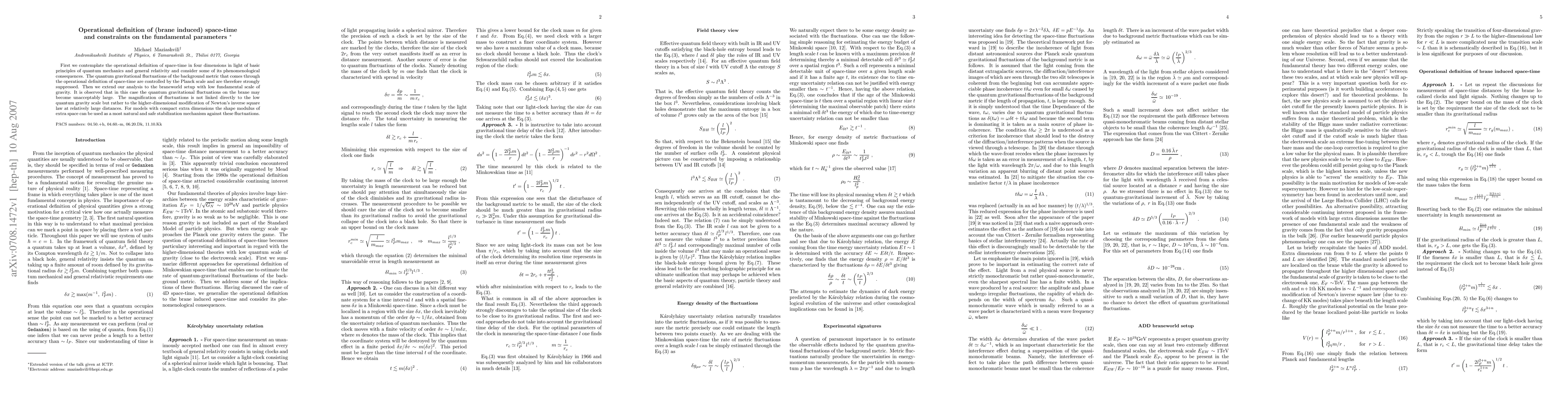 First we contemplate the operational definition of space-time in four dimensions in light of basic principles of quantum mechanics and general relativity and consider some of its phenomenological consequences. The quantum gravitational fluctuations of the background metric that comes through the operational definition of space-time are controlled by the Planck scale and are therefore strongly suppressed. Then we extend our analysis to the braneworld setup with low fundamental scale of gravity. It is observed that in this case the quantum gravitational fluctuations on the brane may become unacceptably large. The magnification of fluctuations is not linked directly to the low quantum gravity scale but rather to the higher-dimensional modification of Newton's inverse square law at relatively large distances. For models with compact extra dimensions the shape modulus of extra space can be used as a most natural and safe stabilization mechanism against these fluctuations.