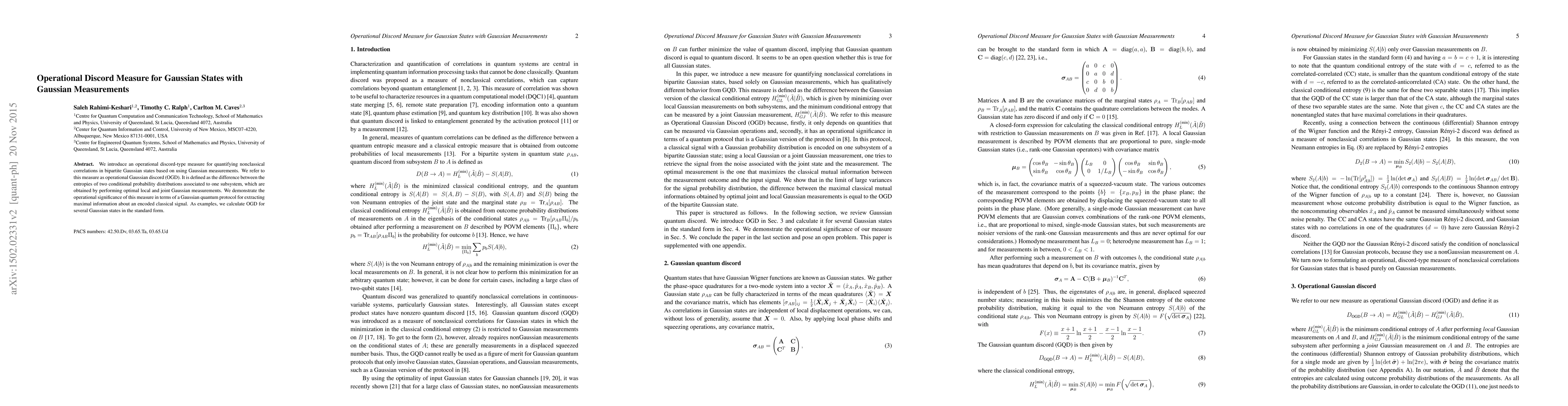 This paper introduces an operational Gaussian discord (OGD) measure to quantify nonclassical correlations in bipartite Gaussian states using Gaussian measurements. OGD is shown to be significant in extracting maximal information in a Gaussian quantum protocol for classical signal encoding.