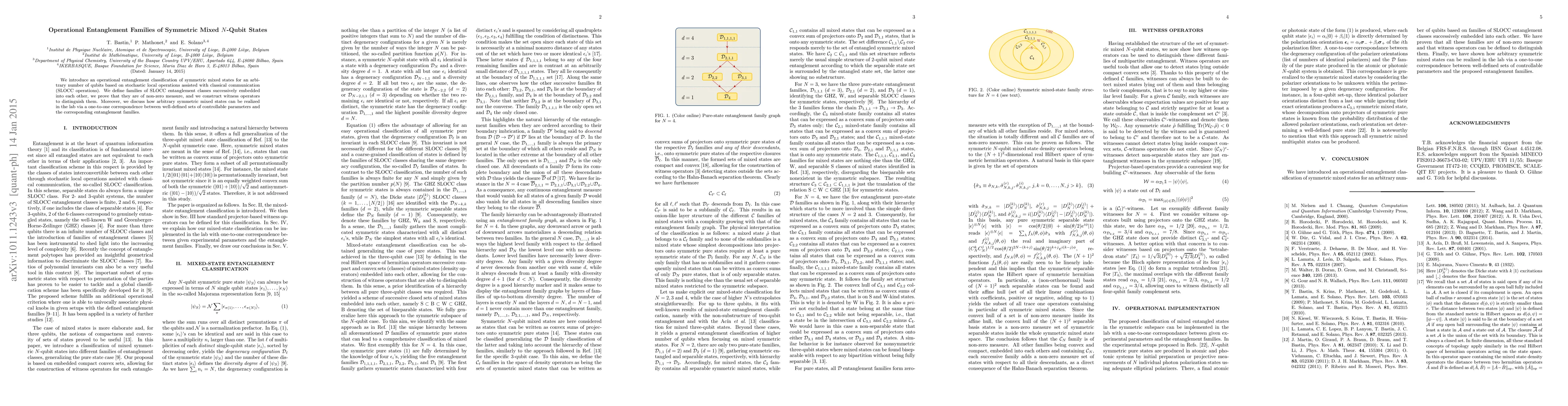 This paper introduces an operational entanglement classification for symmetric mixed N-qubit states using SLOCC operations, defining nested entanglement classes and proving their non-zero measure. It also constructs witness operators to distinguish these classes and discusses their practical realization in lab settings.