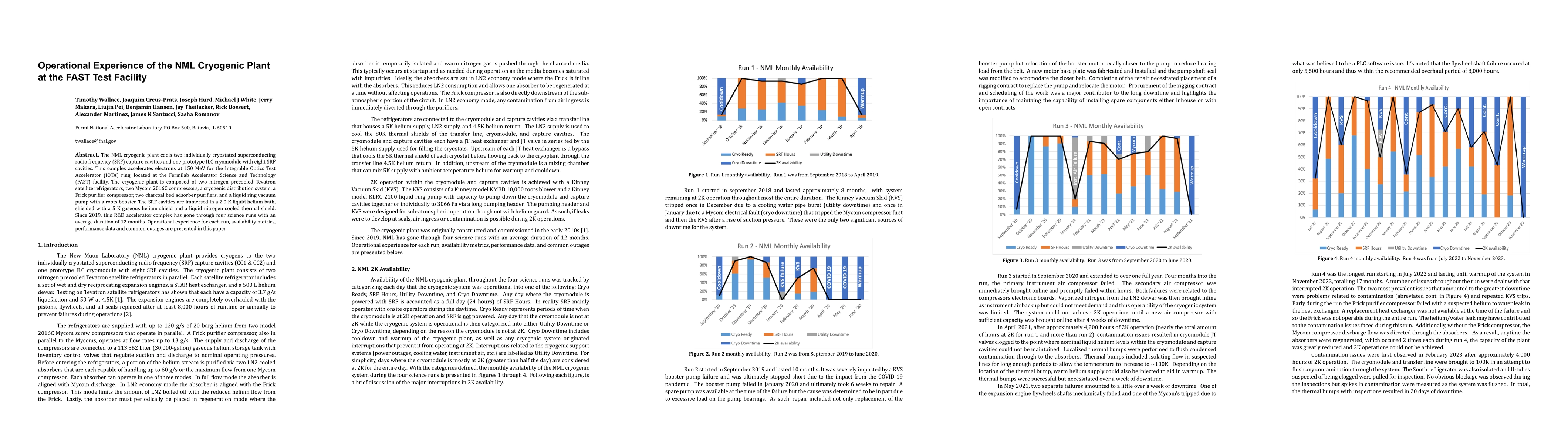 The NML cryogenic plant cools two individually cryostated superconducting radio frequency (SRF) capture cavities and one prototype ILC cryomodule with eight SRF cavities. This complex accelerates electrons at 150 MeV for the Integrable Optics Test Accelerator (IOTA) ring, located at the Fermilab Accelerator Science and Technology (FAST) facility. The cryogenic plant is composed of two nitrogen precooled Tevatron satellite refrigerators, two Mycom 2016C compressors, a cryogenic distribution system, a Frick purifier compressor, two charcoal bed adsorber purifiers, and a liquid ring vacuum pump with a roots booster. The SRF cavities are immersed in a 2.0 K liquid helium bath, shielded with a 5 K gaseous helium shield and a liquid nitrogen cooled thermal shield. Since 2019, this R&D accelerator complex has gone through four science runs with an average duration of 12 months. Operational experience for each run, availability metrics, performance data and common outages are presented in this paper.