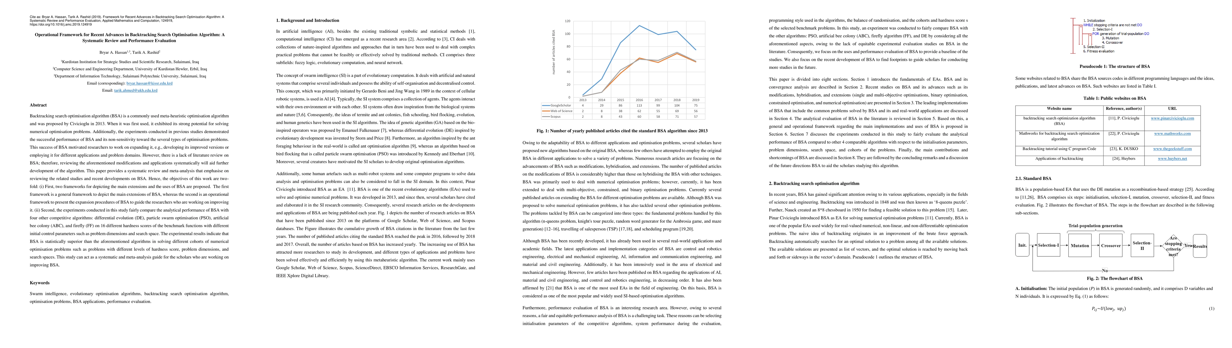 The experiments conducted in previous studies demonstrated the successful performance of BSA and its non-sensitivity toward the several types of optimisation problems. This success of BSA motivated researchers to work on expanding it, e.g., developing its improved versions or employing it for different applications and problem domains. However, there is a lack of literature review on BSA; therefore, reviewing the aforementioned modifications and applications systematically will aid further development of the algorithm. This paper provides a systematic review and meta-analysis that emphasise on reviewing the related studies and recent developments on BSA. Hence, the objectives of this work are two-fold: (i) First, two frameworks for depicting the main extensions and the uses of BSA are proposed. The first framework is a general framework to depict the main extensions of BSA, whereas the second is an operational framework to present the expansion procedures of BSA to guide the researchers who are working on improving it. (ii) Second, the experiments conducted in this study fairly compare the analytical performance of BSA with four other competitive algorithms: differential evolution (DE), particle swarm optimisation (PSO), artificial bee colony (ABC), and firefly (FF) on 16 different hardness scores of the benchmark functions with different initial control parameters such as problem dimensions and search space. The experimental results indicate that BSA is statistically superior than the aforementioned algorithms in solving different cohorts of numerical optimisation problems such as problems with different levels of hardness score, problem dimensions, and search spaces.