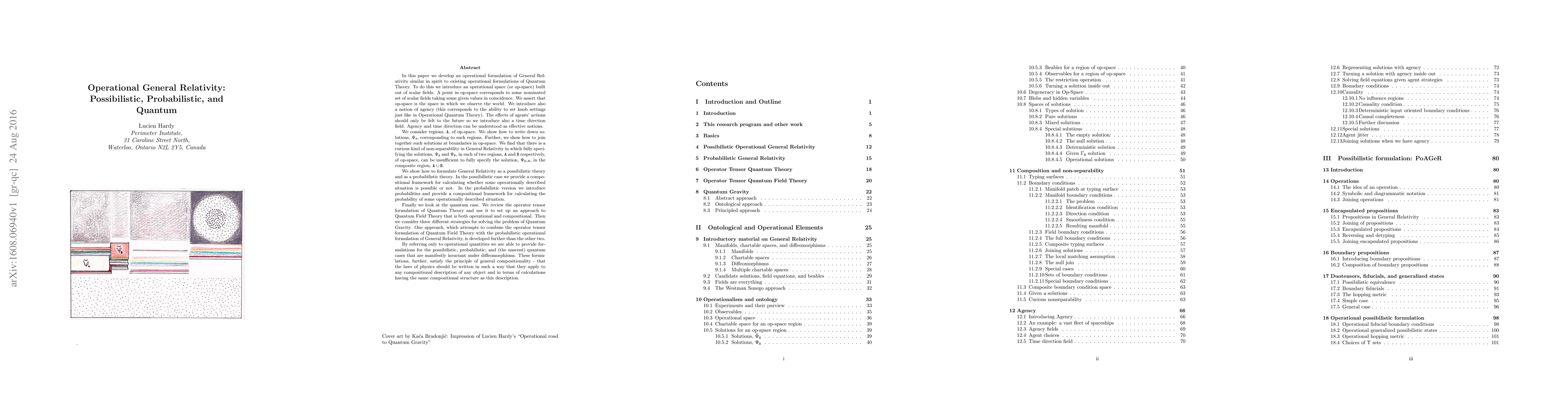 In this paper we develop an operational formulation of General Relativity similar in spirit to existing operational formulations of Quantum Theory. To do this we introduce an operational space (or op-space) built out of scalar fields. A point in op-space corresponds to some nominated set of scalar fields taking some given values in coincidence. We assert that op-space is the space in which we observe the world. We introduce also a notion of agency (this corresponds to the ability to set knob settings just like in Operational Quantum Theory). The effects of agents' actions should only be felt to the future so we introduce also a time direction field. Agency and time direction can be understood as effective notions. We show how to formulate General Relativity as a possibilistic theory and as a probabilistic theory. In the possibilistic case we provide a compositional framework for calculating whether some operationally described situation is possible or not. In the probabilistic version we introduce probabilities and provide a compositional framework for calculating the probability of some operationally described situation. Finally we look at the quantum case. We review the operator tensor formulation of Quantum Theory and use it to set up an approach to Quantum Field Theory that is both operational and compositional. Then we consider strategies for solving the problem of Quantum Gravity. By referring only to operational quantities we are able to provide formulations for the possibilistic, probabilistic, and (the nascent) quantum cases that are manifestly invariant under diffeomorphisms.
