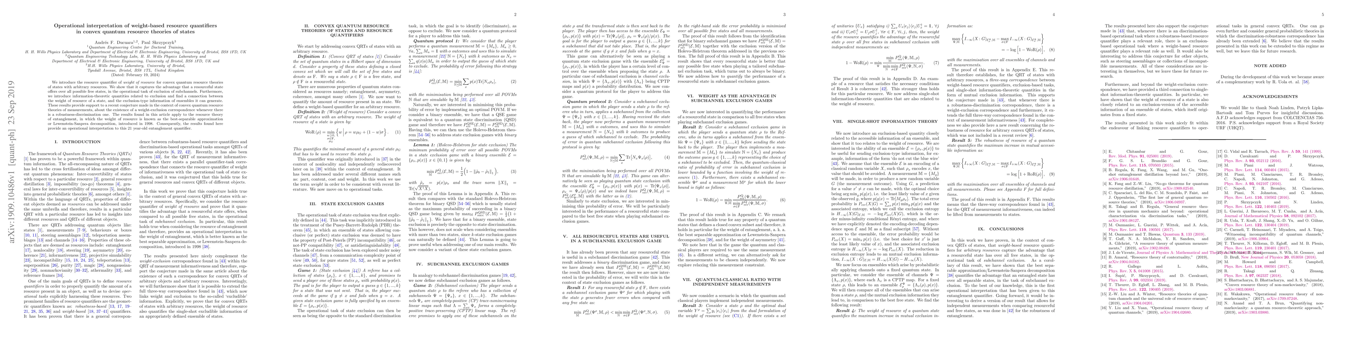 This paper introduces a resource quantifier called "weight of resource" for convex quantum resource theories, showing it captures the advantage of resourceful states over free states in exclusion tasks. It connects this weight to exclusion-type information and supports a conjecture linking robustness-discrimination to weight-exclusion correspondences, ultimately providing an operational interpretation for a 21-year-old entanglement quantifier.