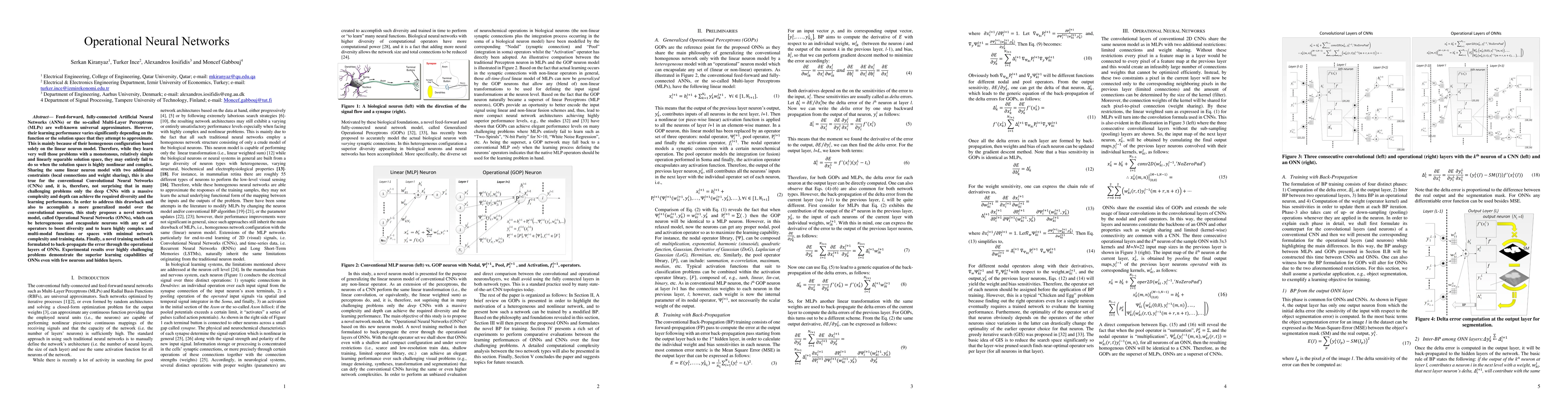 Feed-forward, fully-connected Artificial Neural Networks (ANNs) or the so-called Multi-Layer Perceptrons (MLPs) are well-known universal approximators. However, their learning performance varies significantly depending on the function or the solution space that they attempt to approximate. This is mainly because of their homogenous configuration based solely on the linear neuron model. Therefore, while they learn very well those problems with a monotonous, relatively simple and linearly separable solution space, they may entirely fail to do so when the solution space is highly nonlinear and complex. Sharing the same linear neuron model with two additional constraints (local connections and weight sharing), this is also true for the conventional Convolutional Neural Networks (CNNs) and, it is, therefore, not surprising that in many challenging problems only the deep CNNs with a massive complexity and depth can achieve the required diversity and the learning performance. In order to address this drawback and also to accomplish a more generalized model over the convolutional neurons, this study proposes a novel network model, called Operational Neural Networks (ONNs), which can be heterogeneous and encapsulate neurons with any set of operators to boost diversity and to learn highly complex and multi-modal functions or spaces with minimal network complexity and training data. Finally, a novel training method is formulated to back-propagate the error through the operational layers of ONNs. Experimental results over highly challenging problems demonstrate the superior learning capabilities of ONNs even with few neurons and hidden layers.