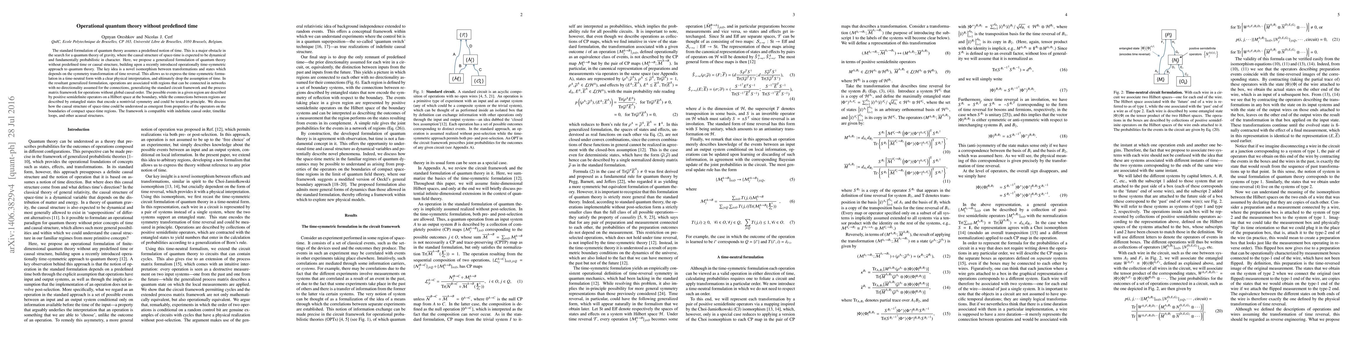 The standard formulation of quantum theory assumes a predefined notion of time. This is a major obstacle in the search for a quantum theory of gravity, where the causal structure of space-time is expected to be dynamical and fundamentally probabilistic in character. Here, we propose a generalized formulation of quantum theory without predefined time or causal structure, building upon a recently introduced operationally time-symmetric approach to quantum theory. The key idea is a novel isomorphism between transformations and states which depends on the symmetry transformation of time reversal. This allows us to express the time-symmetric formulation in a time-neutral form with a clear physical interpretation, and ultimately drop the assumption of time. In the resultant generalized formulation, operations are associated with regions that can be connected in networks with no directionality assumed for the connections, generalizing the standard circuit framework and the process matrix framework for operations without global causal order. The possible events in a given region are described by positive semidefinite operators on a Hilbert space at the boundary, while the connections between regions are described by entangled states that encode a nontrivial symmetry and could be tested in principle. We discuss how the causal structure of space-time could be understood as emergent from properties of the operators on the boundaries of compact space-time regions. The framework is compatible with indefinite causal order, timelike loops, and other acausal structures.