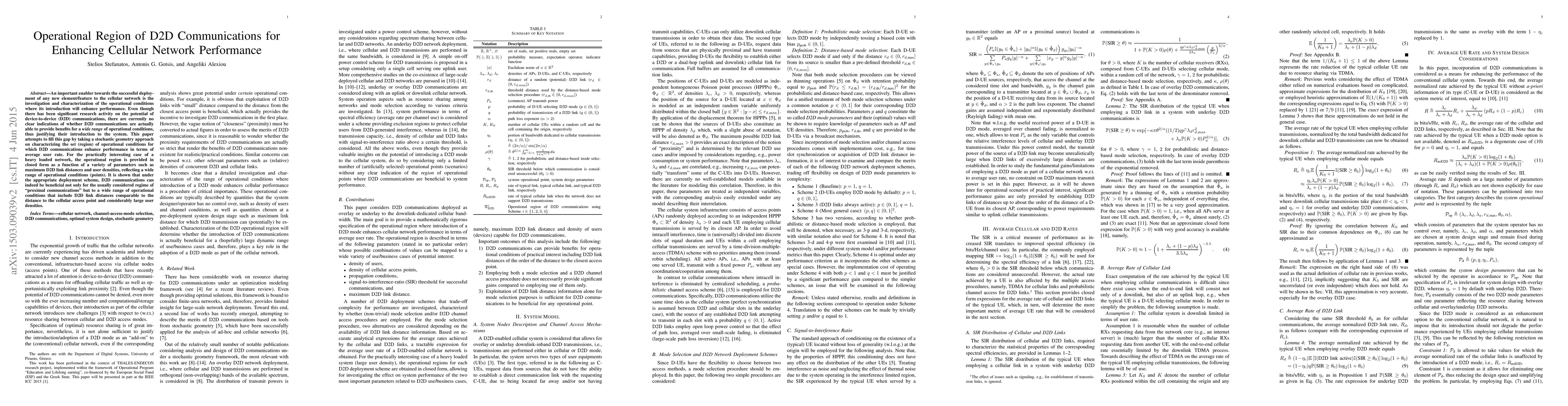 This paper investigates the operational conditions under which device-to-device (D2D) communications enhance cellular network performance, using a stochastic geometry approach. It finds that D2D communications can benefit a wide range of conditions, including large user densities and D2D link distances comparable to those to cellular access points.