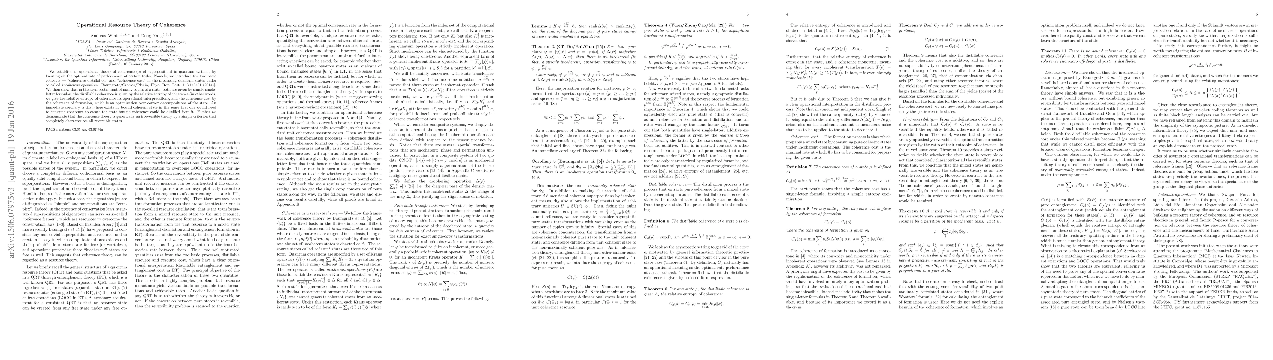 This paper develops an operational theory of coherence in quantum systems, introducing "coherence distillation" and "coherence cost" concepts. It reveals that distillable coherence is linked to the relative entropy of coherence, while coherence cost relates to the coherence of formation, establishing an irreversible coherence theory.