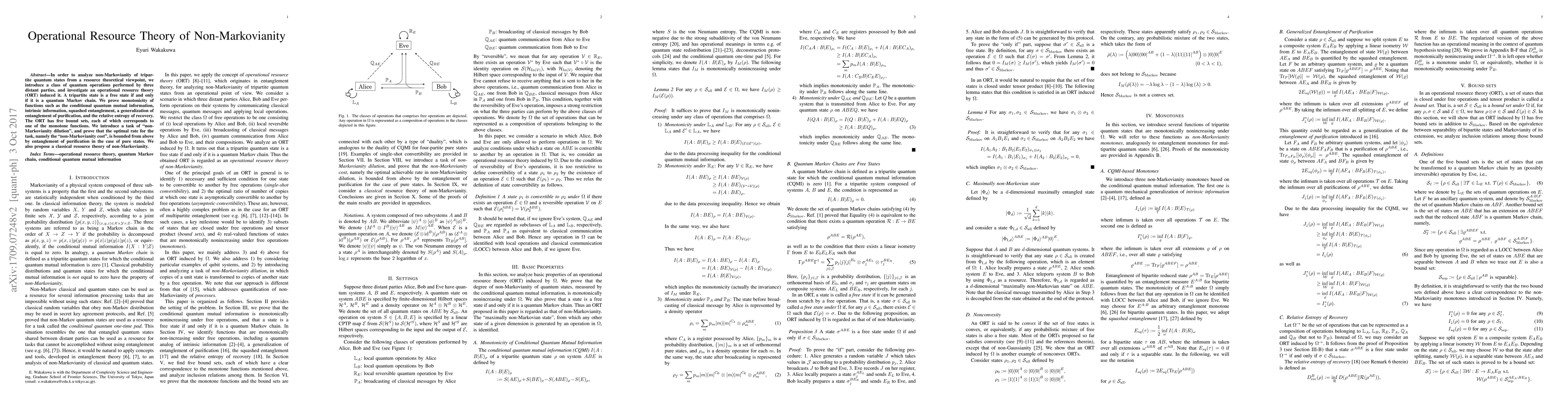 In order to analyze non-Markovianity of tripartite quantum states from a resource theoretical viewpoint, we introduce a class of quantum operations performed by three distant parties, and investigate an operational resource theory (ORT) induced it. A tripartite state is a free state if and only if it is a quantum Markov chain. We prove monotonicity of functions such as the conditional quantum mutual information, intrinsic information, squashed entanglement, a generalization of entanglement of purification, and the relative entropy of recovery. The ORT has five bound sets, each of which corresponds to one of the monotone functions. We introduce a task of "non-Markovianity dilution", and prove that the optimal rate for the task, namely the "non-Markovianity cost", is bounded from above by entanglement of purification in the case of pure states. We also propose a classical resource theory of non-Markovianity.