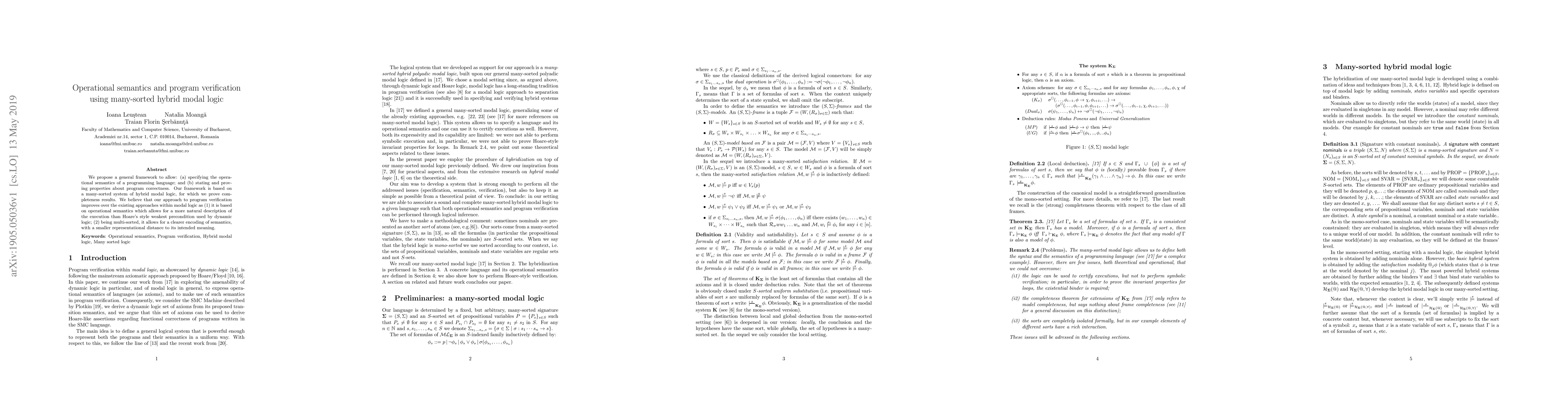 We propose a general framework to allow: (a) specifying the operational semantics of a programming language; and (b) stating and proving properties about program correctness. Our framework is based on a many-sorted system of hybrid modal logic, for which we prove completeness results. We believe that our approach to program verification improves over the existing approaches within modal logic as (1) it is based on operational semantics which allows for a more natural description of the execution than Hoare's style weakest precondition used by dynamic logic; (2) being multi-sorted, it allows for a clearer encoding of semantics, with a smaller representational distance to its intended meaning.