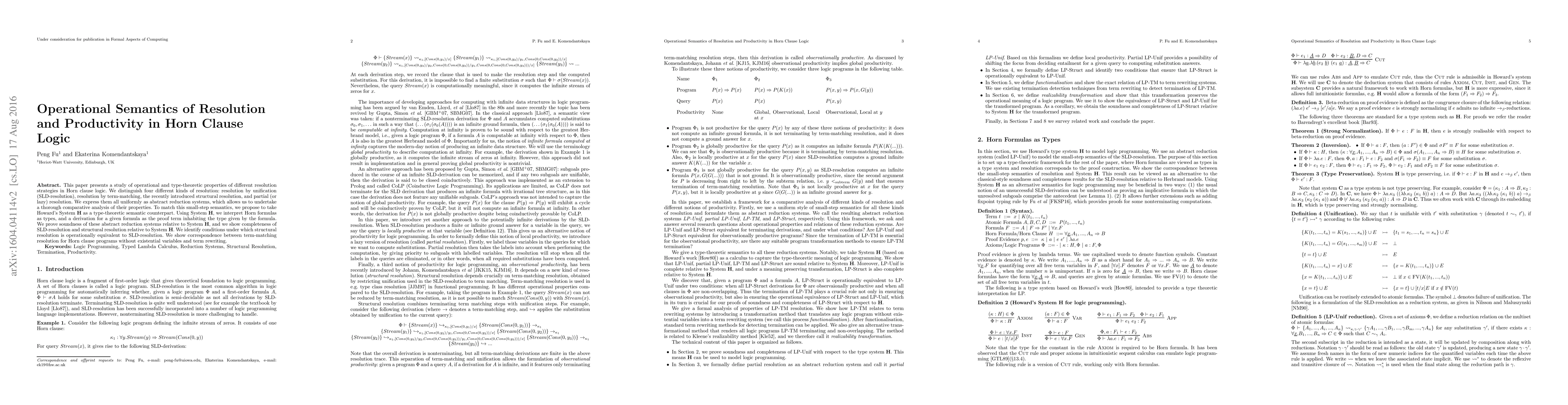 This paper presents a study of operational and type-theoretic properties of different resolution strategies in Horn clause logic. We distinguish four different kinds of resolution: resolution by unification (SLD-resolution), resolution by term-matching, the recently introduced structural resolution, and partial (or lazy) resolution. We express them all uniformly as abstract reduction systems, which allows us to undertake a thorough comparative analysis of their properties. To match this small-step semantics, we propose to take Howard's System H as a type-theoretic semantic counterpart. Using System H, we interpret Horn formulas as types, and a derivation for a given formula as the proof term inhabiting the type given by the formula. We prove soundness of these abstract reduction systems relative to System H, and we show completeness of SLD-resolution and structural resolution relative to System H. We identify conditions under which structural resolution is operationally equivalent to SLD-resolution. We show correspondence between term-matching resolution for Horn clause programs without existential variables and term rewriting.