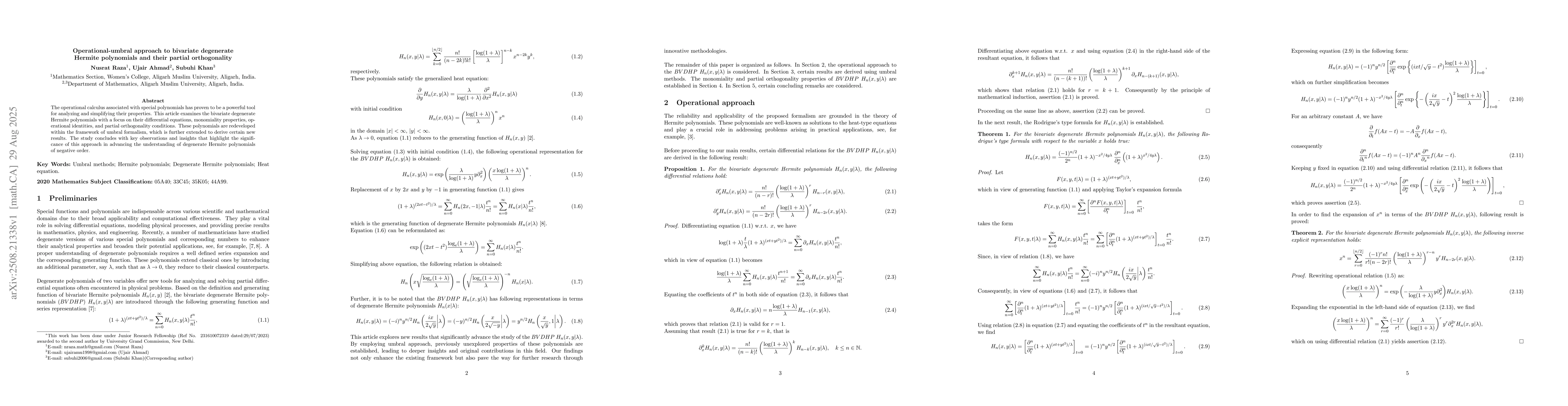 The operational calculus associated with special polynomials has proven to be a powerful tool for analyzing and simplifying their properties. This article examines the bivariate degenerate Hermite polynomials with a focus on their differential equations, monomiality properties, operational identities, and partial orthogonality conditions. These polynomials are redeveloped within the framework of umbral formalism, which is further extended to derive certain new results. The study concludes with key observations and insights that highlight the significance of this approach in advancing the understanding of degenerate Hermite polynomials of negative order.