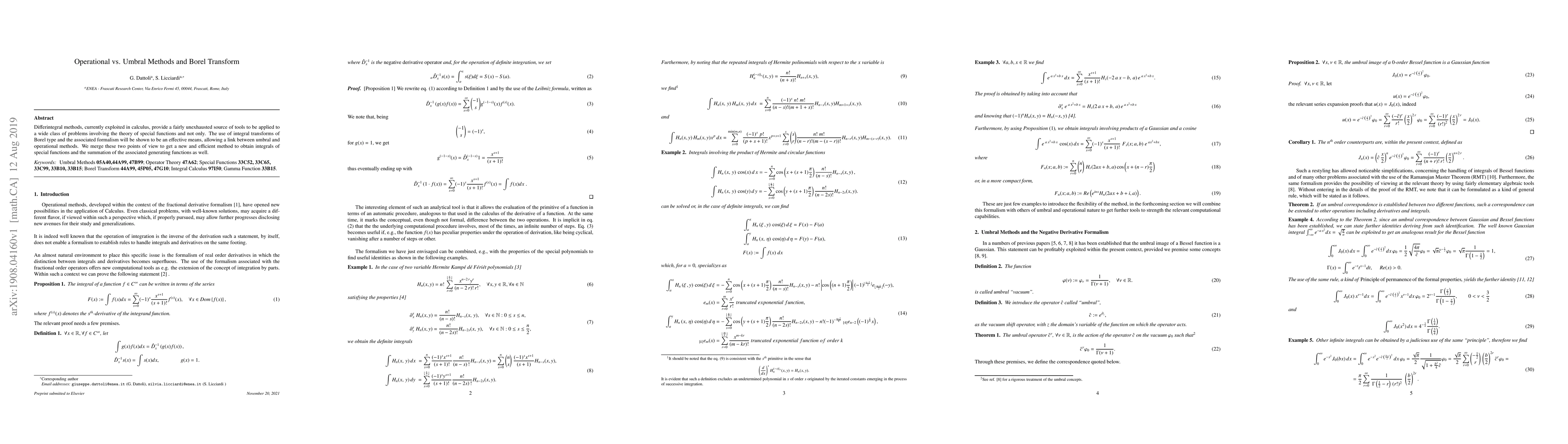 This paper explores the application of differintegral methods in calculus, demonstrating how Borel transforms and their associated formalism can effectively link umbral and operational methods. It proposes a new approach to compute integrals of special functions and sum generating functions.