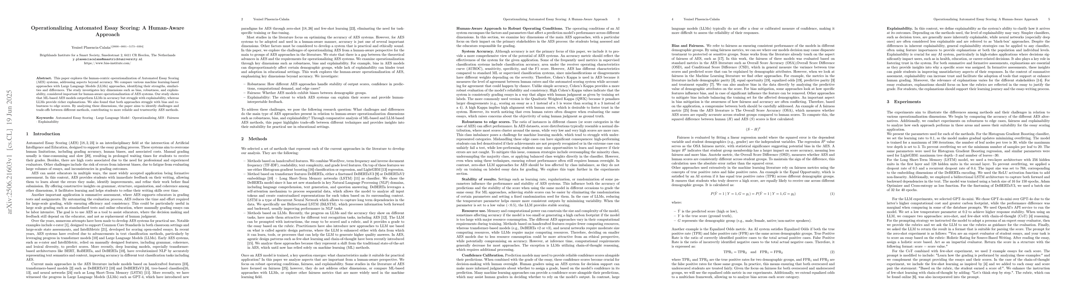 This paper explores the human-centric operationalization of Automated Essay Scoring (AES) systems, addressing aspects beyond accuracy. We compare various machine learning-based approaches with Large Language Models (LLMs) approaches, identifying their strengths, similarities and differences. The study investigates key dimensions such as bias, robustness, and explainability, considered important for human-aware operationalization of AES systems. Our study shows that ML-based AES models outperform LLMs in accuracy but struggle with explainability, whereas LLMs provide richer explanations. We also found that both approaches struggle with bias and robustness to edge scores. By analyzing these dimensions, the paper aims to identify challenges and trade-offs between different methods, contributing to more reliable and trustworthy AES methods.