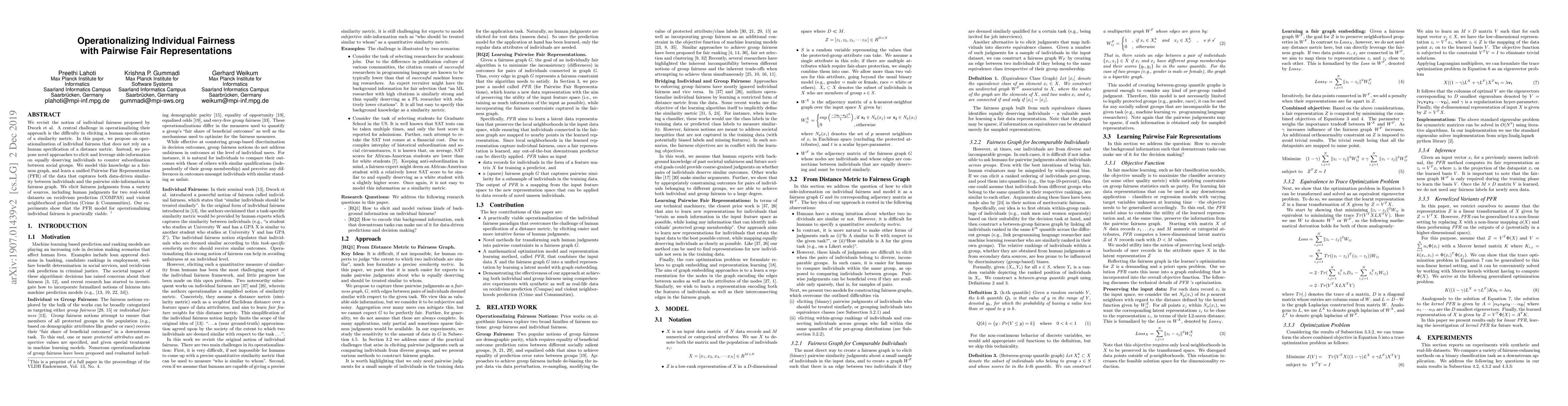 This paper proposes a novel method for operationalizing individual fairness without requiring a human-specified similarity metric, instead using side-information to identify equally deserving individuals. It introduces a Pairwise Fair Representation (PFR) model that leverages a fairness graph to counter subordination between social groups, validated through experiments on recidivism and neighborhood crime prediction datasets.