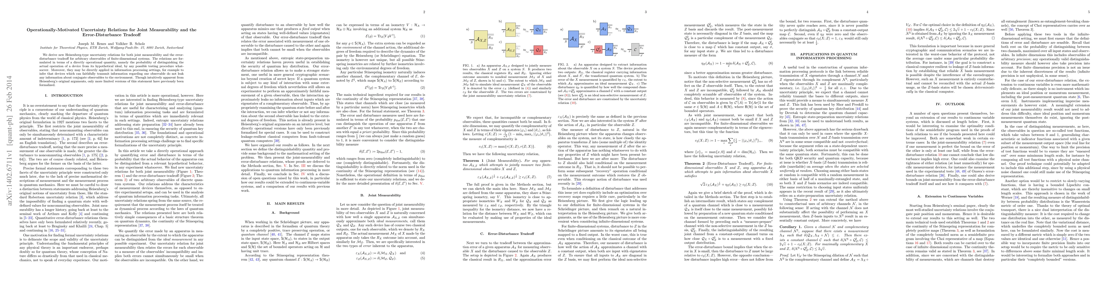 We derive new Heisenberg-type uncertainty relations for both joint measurability and the error-disturbance tradeoff for arbitrary observables of finite-dimensional systems. The relations are formulated in terms of a directly operational quantity, namely the probability of distinguishing the actual operation of a device from its hypothetical ideal, by any possible testing procedure whatsoever. Moreover, they may be directly applied in information processing settings, for example to infer that devices which can faithfully transmit information regarding one observable do not leak any information about conjugate observables to the environment. Though intuitively apparent from Heisenberg's original arguments, only more limited versions of this statement have previously been formalized.