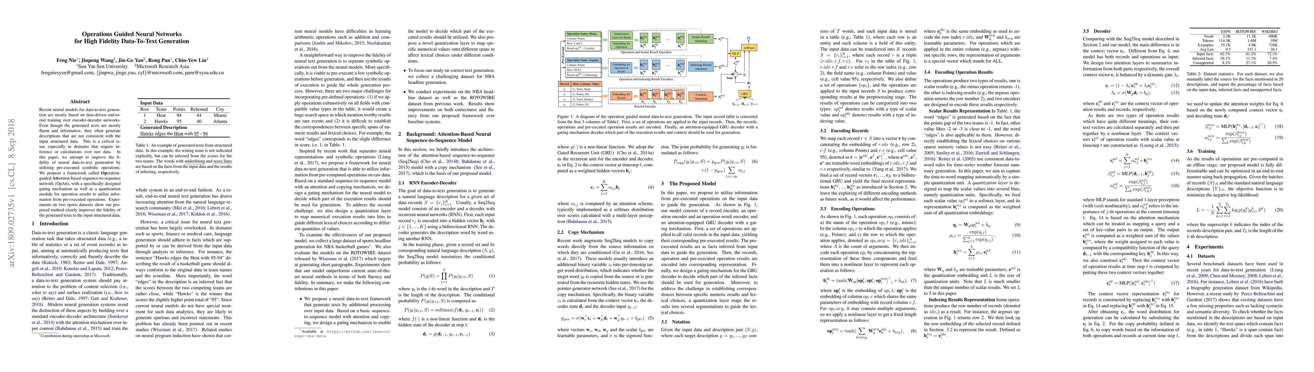 This paper proposes a framework called OpAtt to enhance the fidelity of neural data-to-text generation by incorporating pre-executed symbolic operations. The method improves consistency between generated texts and input structured data, particularly in domains requiring accurate inference or calculations.