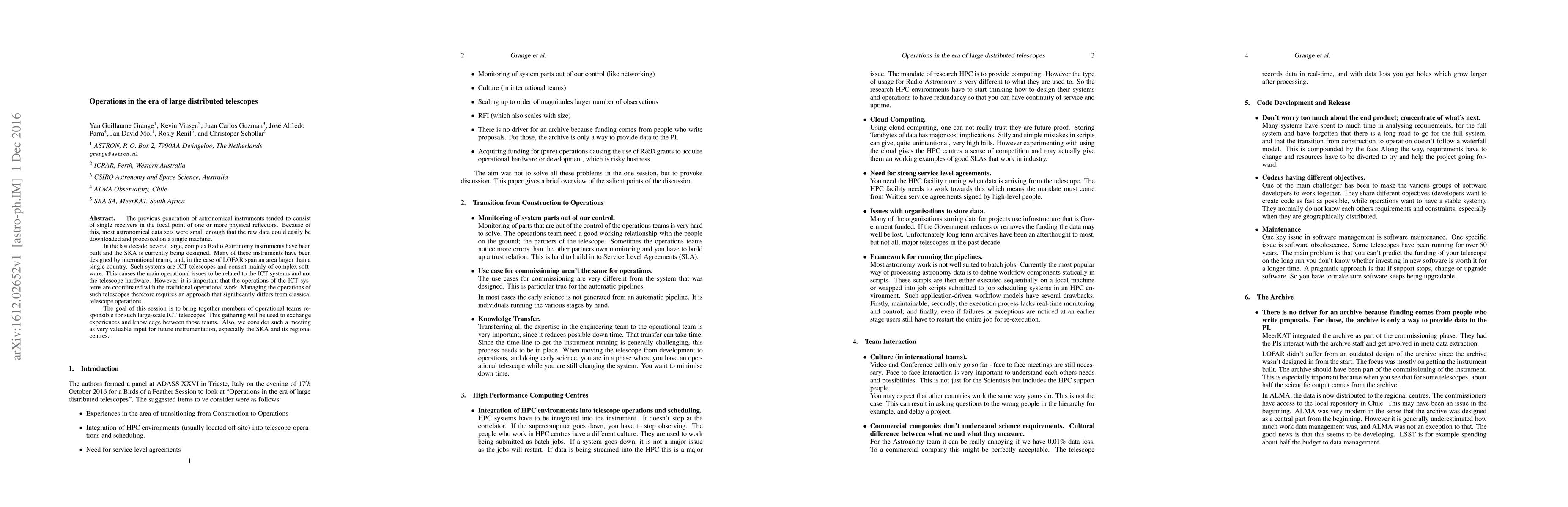 The previous generation of astronomical instruments tended to consist of single receivers in the focal point of one or more physical reflectors. Because of this, most astronomical data sets were small enough that the raw data could easily be downloaded and processed on a single machine. In the last decade, several large, complex Radio Astronomy instruments have been built and the SKA is currently being designed. Many of these instruments have been designed by international teams, and, in the case of LOFAR span an area larger than a single country. Such systems are ICT telescopes and consist mainly of complex software. This causes the main operational issues to be related to the ICT systems and not the telescope hardware. However, it is important that the operations of the ICT systems are coordinated with the traditional operational work. Managing the operations of such telescopes therefore requires an approach that significantly differs from classical telescope operations. The goal of this session is to bring together members of operational teams responsible for such large-scale ICT telescopes. This gathering will be used to exchange experiences and knowledge between those teams. Also, we consider such a meeting as very valuable input for future instrumentation, especially the SKA and its regional centres.