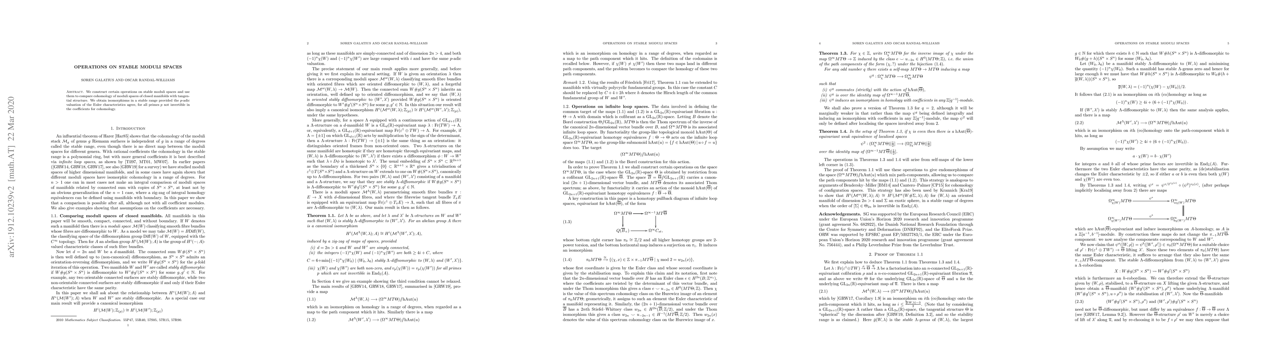 We construct certain operations on stable moduli spaces and use them to compare cohomology of moduli spaces of closed manifolds with tangential structure. We obtain isomorphisms in a stable range provided the $p$-adic valuation of the Euler characteristics agree, for all primes $p$ not invertible in the coefficients for cohomology.
