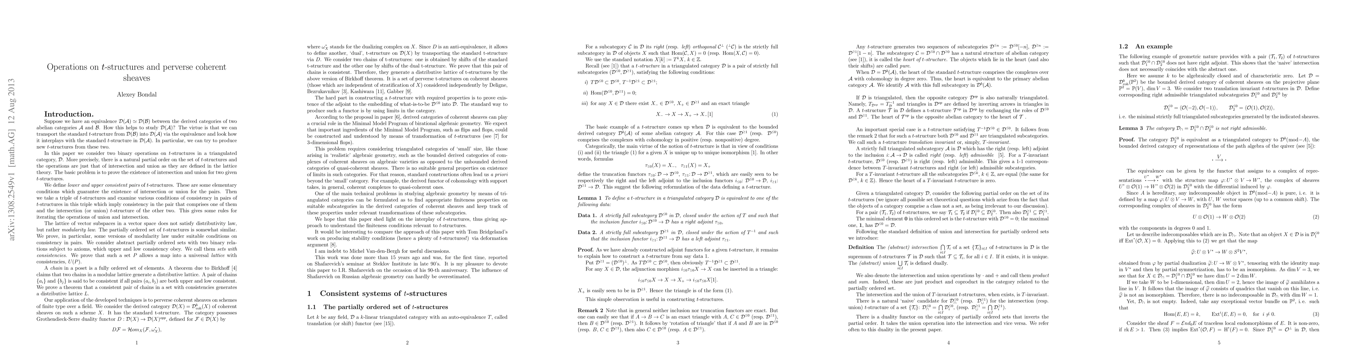 This paper introduces consistent pairs and chains of t-structures, proving that two such chains generate a distributive lattice. The developed technique is applied to the derived category of coherent sheaves, resulting in a family of t-structures with hearts known as perverse coherent sheaves.