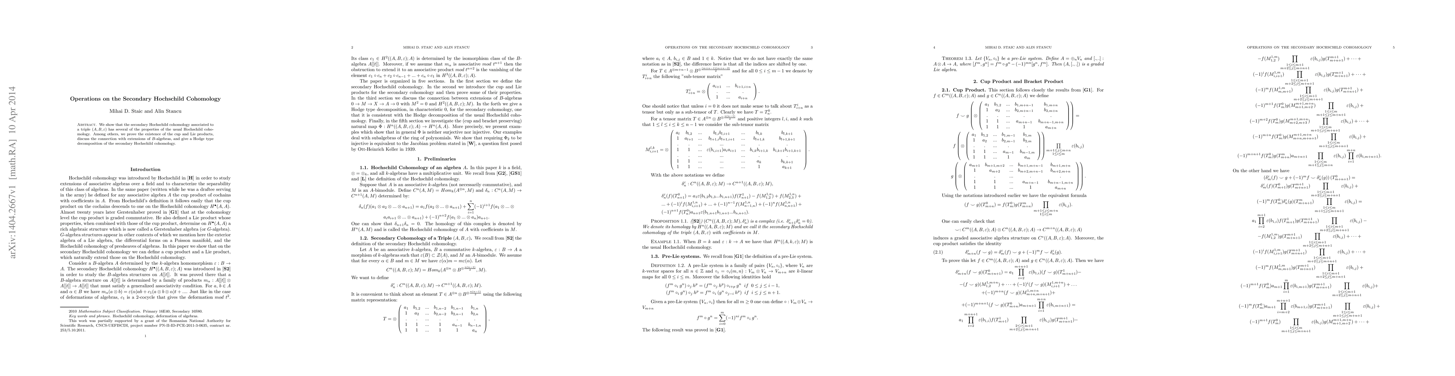 We show that the secondary Hochschild cohomology associated to a triple $(A,B,\varepsilon)$ has several of the properties of the usual Hochschild cohomology. Among others, we prove the existence of the cup and Lie products, discuss the connection with extensions of $B$-algebras, and give a Hodge type decomposition of the secondary Hochschild cohomology.