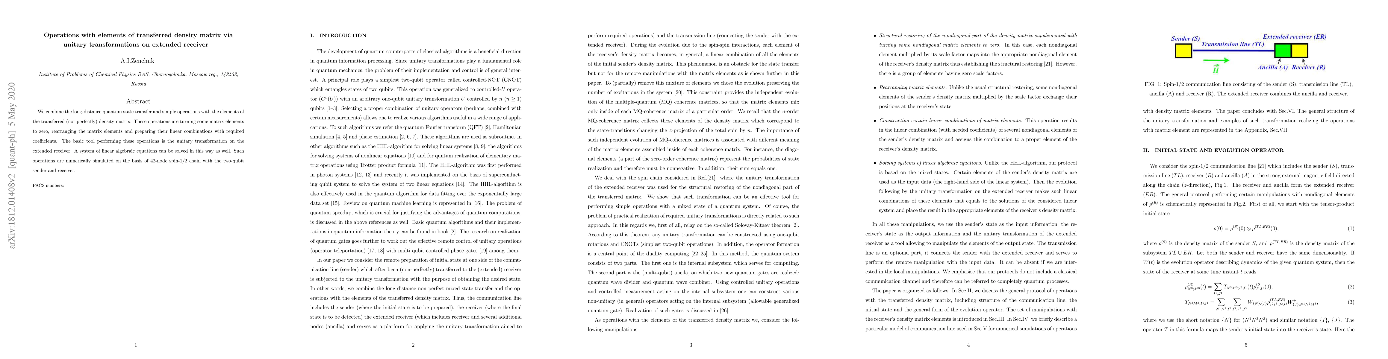 Using the tool of unitary transformations of the extended receiver we perform simple operations with the non-diagonal elements of the initial sender's density matrix after their transferring to the receiver. These operations are following: turning some matrix elements to zero, rearranging the matrix elements and preparing their linear combinations with required coefficients. We also propose a protocol for solving a system of linear algebraic equations with a system of two equations as an example. Such operations are numerically simulated on the basis of 42-node spin-1/2 chain with the two-qubit sender and receiver.