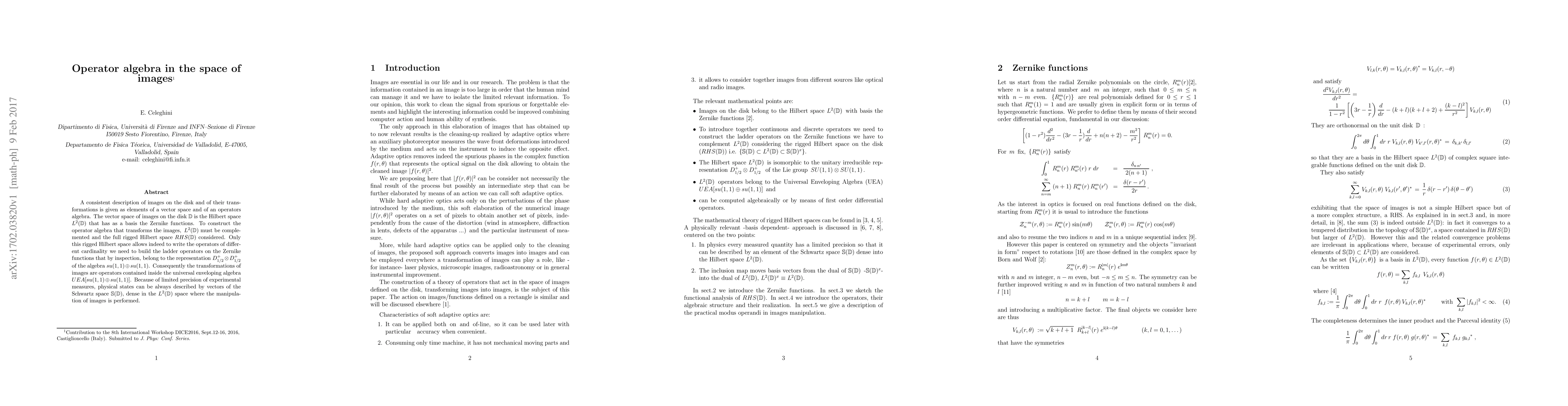 A consistent description of images on the disk and of their transformations is given as elements of a vector space and of an operators algebra. The vector space of images on the disk $\mathbb{D}$ is the Hilbert space $L^2(\mathbb{D})$ that has as a basis the Zernike functions. To construct the operator algebra that transforms the images $L^2(\mathbb{D})$ must be complemented and the full rigged Hilbert space $RHS(\mathbb{D})$ considered. Only this rigged Hilbert space allows indeed to write the operators of different cardinality we need to build the ladder operators on the Zernike functions that by inspection, belong to the representation $D_{1/2}^+ \otimes D_{1/2}^+$ of the algebra $su(1,1) \oplus su(1,1)$. Consequently the transformations of images are operators contained inside the universal enveloping algebra $UEA[su(1,1) \oplus su(1,1)]$. Because of limited precision of experimental measures, physical states can be always described by vectors of the Schwartz space $\S(\mathbb{D})$, dense in the $L^2(\mathbb{D})$ space where the manipulation of images is performed.