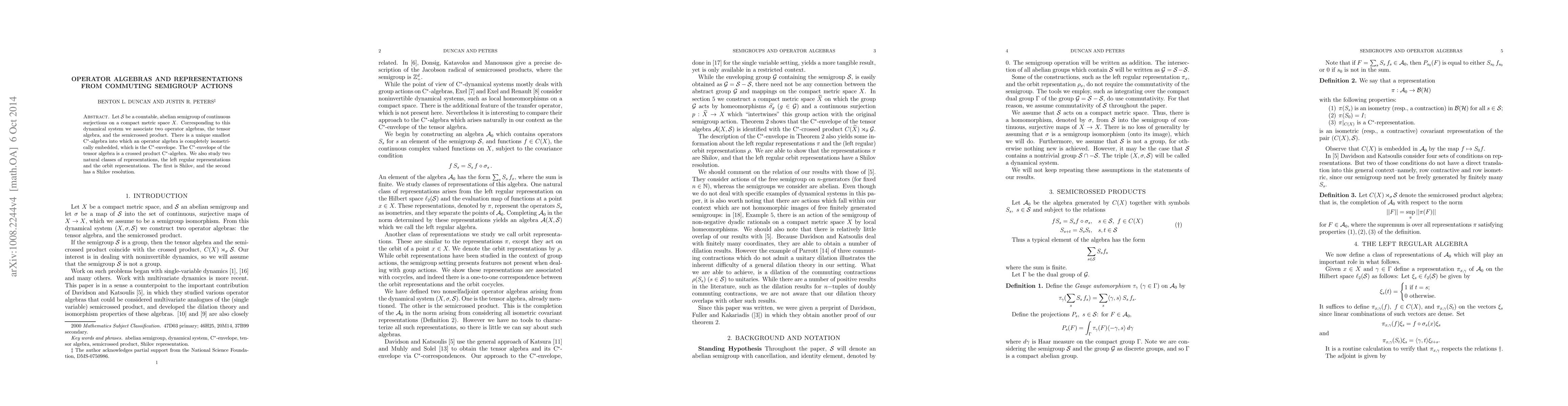 Let $\sS$ be a countable, abelian semigroup of continuous surjections on a compact metric space $X$. Corresponding to this dynamical system we associate two operator algebras, the tensor algebra, and the semicrossed product. There is a unique smallest C$^*$-algebra into which an operator algebra is completely isometrically embedded, which is the C$^*$-envelope. We provide two distinct characterizations of the C$^*$-envelope of the tensor algebra; one developed in a general setting by Katsura, and the other using tools of projective and inductive limits, which gives the C$^*$-envelope as a crossed product C$^*$-algebra. We also study two natural classes of representations, the left regular representations and the orbit representations. The first is Shilov, and the second has a Shilov resolution.