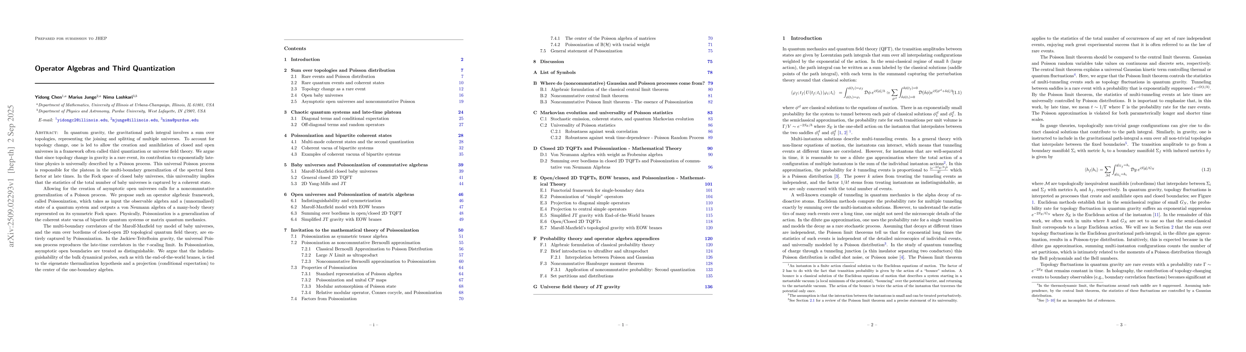 In quantum gravity, the gravitational path integral involves a sum over topologies, representing the joining and splitting of multiple universes. To account for topology change, one is led to allow the creation and annihilation of closed and open universes in a framework often called third quantization or universe field theory. We argue that since topology change in gravity is a rare event, its contribution to exponentially late-time physics is universally described by a Poisson process. This universal Poisson process is responsible for the plateau in the multi-boundary generalization of the spectral form factor at late times. In the Fock space of closed baby universes, this universality implies that the statistics of the total number of baby universes is captured by a coherent state. Allowing for the creation of asymptotic open universes calls for a noncommutative generalization of a Poisson process. We propose such an operator algebraic framework, called Poissonization, which takes as input the observable algebra and a (unnormalized) state of a quantum system and outputs a von Neumann algebra of a many-body theory represented on its symmetric Fock space. Physically, Poissonization is a generalization of the coherent state vacua of bipartite quantum systems or matrix quantum mechanics. The multi-boundary correlators of the Marolf-Maxfield toy model of baby universes, and the sum over bordisms of closed-open 2D topological quantum field theory, are entirely captured by Poissonization. In the Jackiew-Teitelboim gravity, the universal Poisson process reproduces the late-time correlators in the $\tau$-scaling limit.