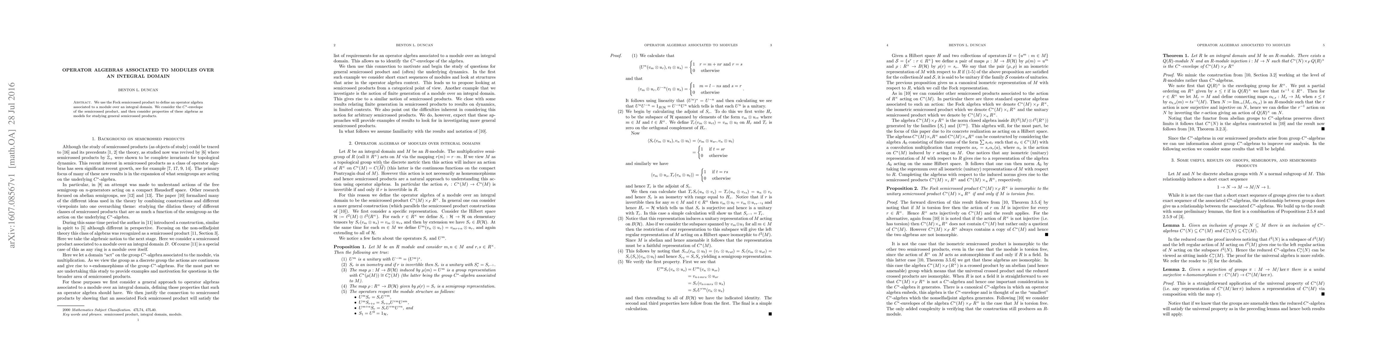 We use the Fock semicrossed product to define an operator algebra associated to a module over an integral domain. We consider the $C^*$-envelope of the semicrossed product, and then consider properties of these algebras as models for studying general semicrossed products.