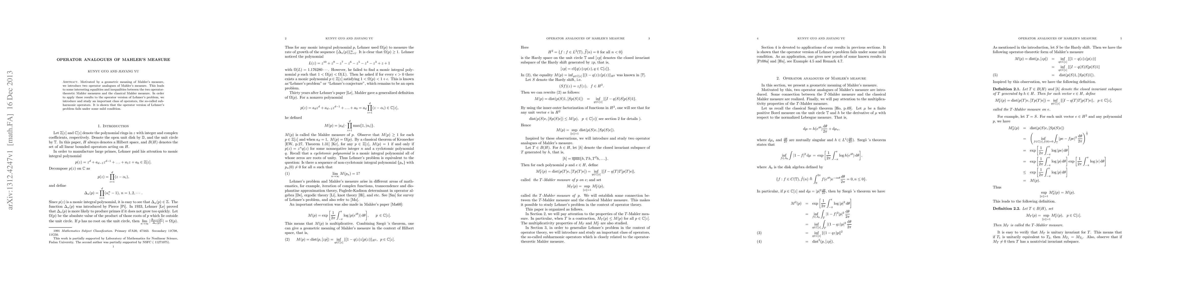 Motivated by a geometric meaning of Mahler's measure, we introduce two operator analogues of Mahler's measure. This leads to some interesting equalities and inequalities between the two operator-theoretic Mahler measures and the classical Mahler measure. In order to apply these results to the operator version of Lehmer's problem, we introduce and study an important class of operators, the so-called subharmonic operators. It is shown that the operator version of Lehmer's problem fails under some mild condition.