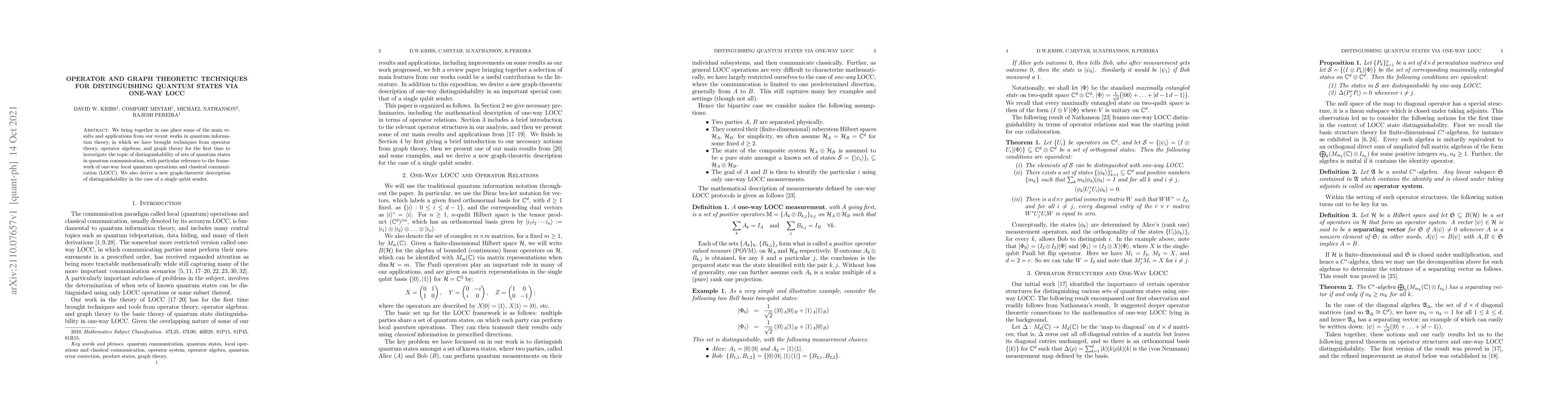 We bring together in one place some of the main results and applications from our recent works in quantum information theory, in which we have brought techniques from operator theory, operator algebras, and graph theory for the first time to investigate the topic of distinguishability of sets of quantum states in quantum communication, with particular reference to the framework of one-way local quantum operations and classical communication (LOCC). We also derive a new graph-theoretic description of distinguishability in the case of a single qubit sender.