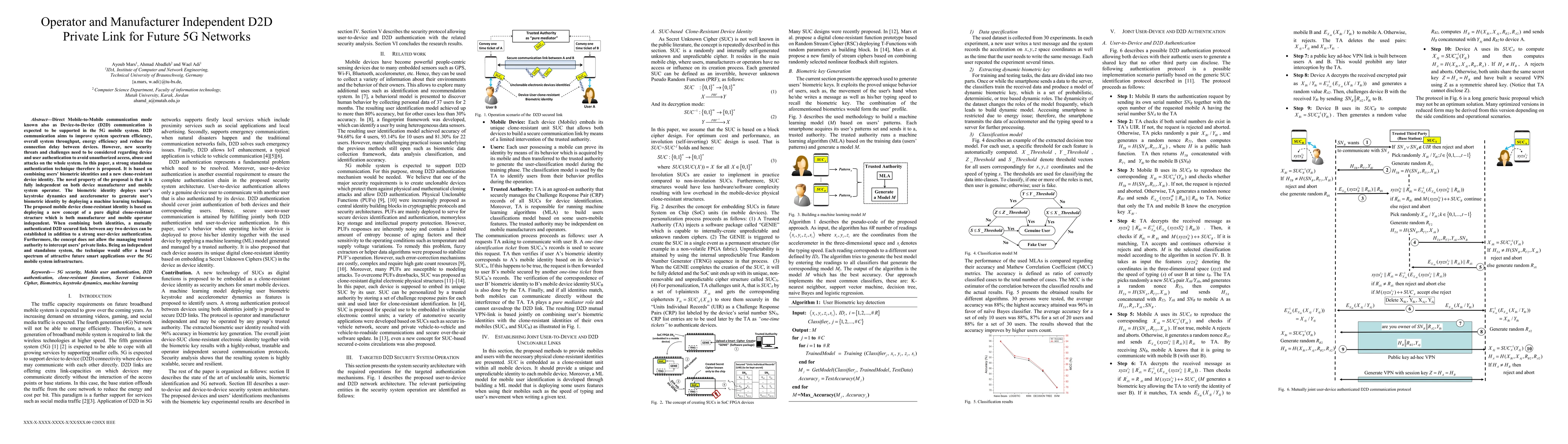 Direct Mobile-to-Mobile communication mode known also as Device-to-Device (D2D) communication is expected to be supported in the 5G mobile system. D2D communication aims to improve system spectrum efficiency, overall system throughput, energy efficiency and reduce the connection delay between devices. However, new security threats and challenges need to be considered regarding device and user authentication to avoid unauthorized access, abuse and attacks on the whole system. In this paper, a strong standalone authentication technique therefore is proposed. It is based on combining users biometric identities and a new clone-resistant device identity. The novel property of the proposal is that it is fully independent on both device manufacturer and mobile system operator. The biometric identity deploys user keystroke dynamics and accelerometer to generate user biometric identity by deploying a machine learning technique. The proposed mobile device clone-resistant identity is based on deploying a new concept of a pure digital clone-resistant structure which is both manufacturer and mobile operator-independent. When combining both identities, a mutually authenticated D2D secured link between any two devices can be established in addition to a strong user-device authentication. Furthermore, the concept does not allow the managing trusted authority to intercept users private links. Being an independent and standalone system, the technique would offer a broad spectrum of attractive future smart applications over the 5G mobile system infrastructure.