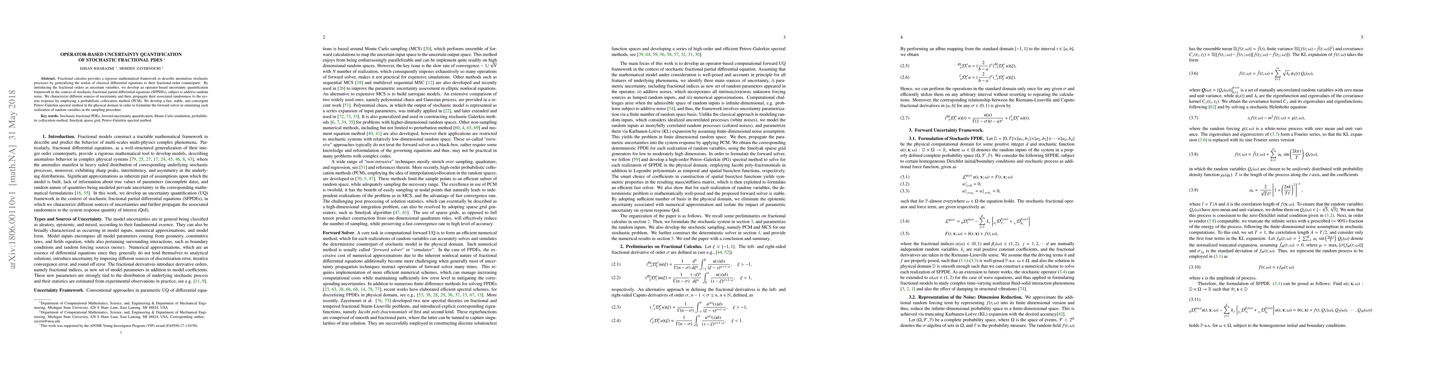 Fractional calculus provides a rigorous mathematical framework to describe anomalous stochastic processes by generalizing the notion of classical differential equations to their fractional-order counterparts. By introducing the fractional orders as uncertain variables, we develop an operator-based uncertainty quantification framework in the context of stochastic fractional partial differential equations (SFPDEs), subject to additive random noise. We characterize different sources of uncertainty and then, propagate their associated randomness to the system response by employing a probabilistic collocation method (PCM). We develop a fast, stable, and convergent Petrov-Galerkin spectral method in the physical domain in order to formulate the forward solver in simulating each realization of random variables in the sampling procedure.