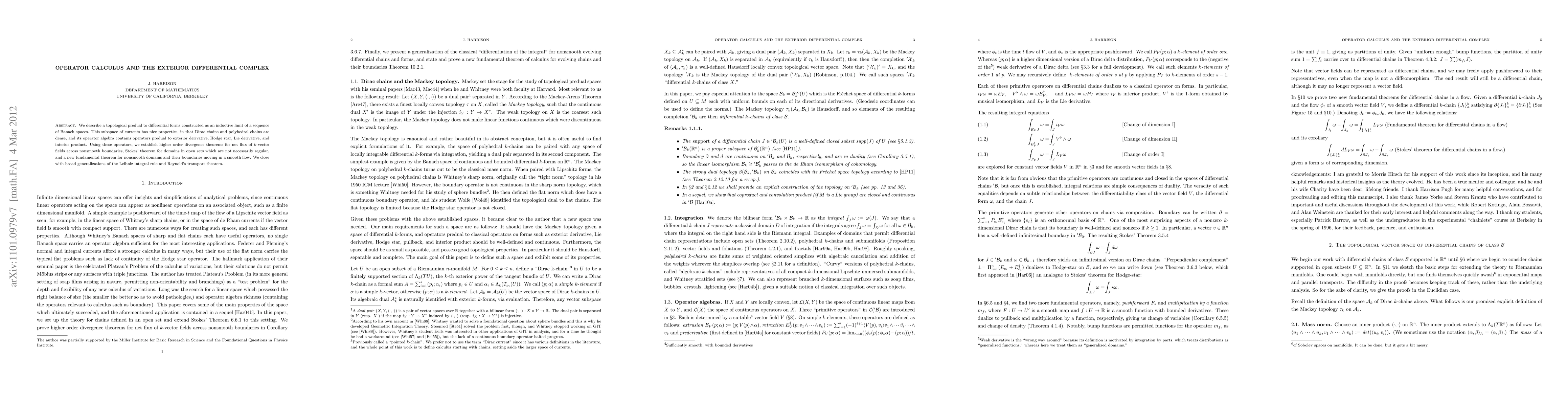 We describe a topological predual to differential forms constructed as an inductive limit of a sequence of Banach spaces. This subspace of currents has nice properties, in that Dirac chains and polyhedral chains are dense, and its operator algebra contains operators predual to exterior derivative, Hodge star, Lie derivative, and interior product. Using these operators, we establish higher order divergence theorems for net flux of k-vector fields across nonsmooth boundaries, Stokes' theorem for domains in open sets which are not necessarily regular, and a new fundamental theorem for nonsmooth domains and their boundaries moving in a smooth flow. We close with broad generalizations of the Leibniz integral rule and Reynold's transport theorem.