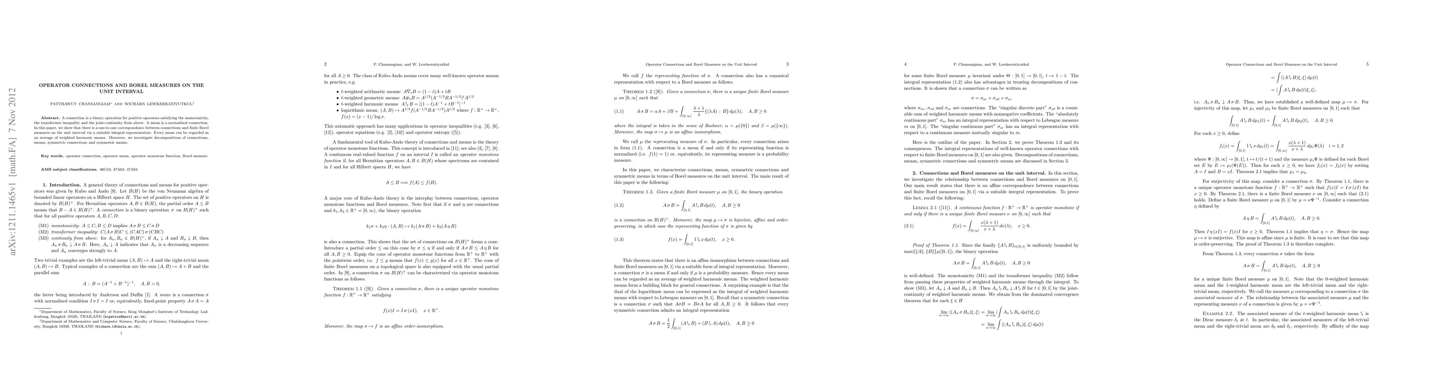 This paper explores the relationship between operator connections and finite Borel measures on the unit interval, demonstrating a one-to-one correspondence via integral representation. It also examines decompositions of connections, means, and their symmetric counterparts.