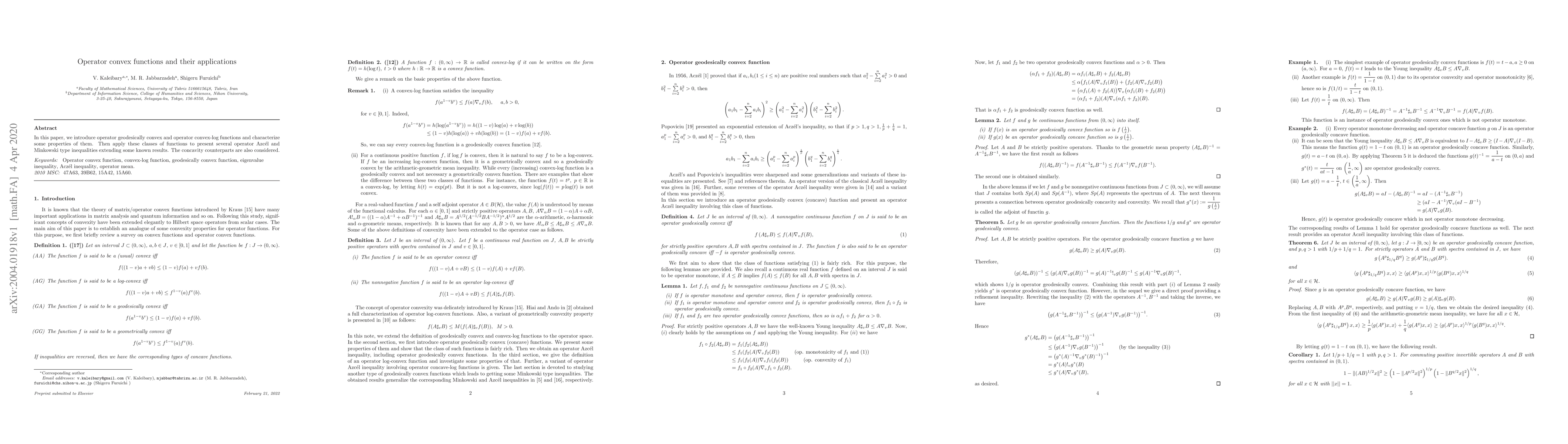 In this paper, we introduce operator geodesically convex and operator convex-log functions and characterize some properties of them. Then apply these classes of functions to present several operator Azc\'{e}l and Minkowski type inequalities extending some known results. The concavity counterparts are also considered.