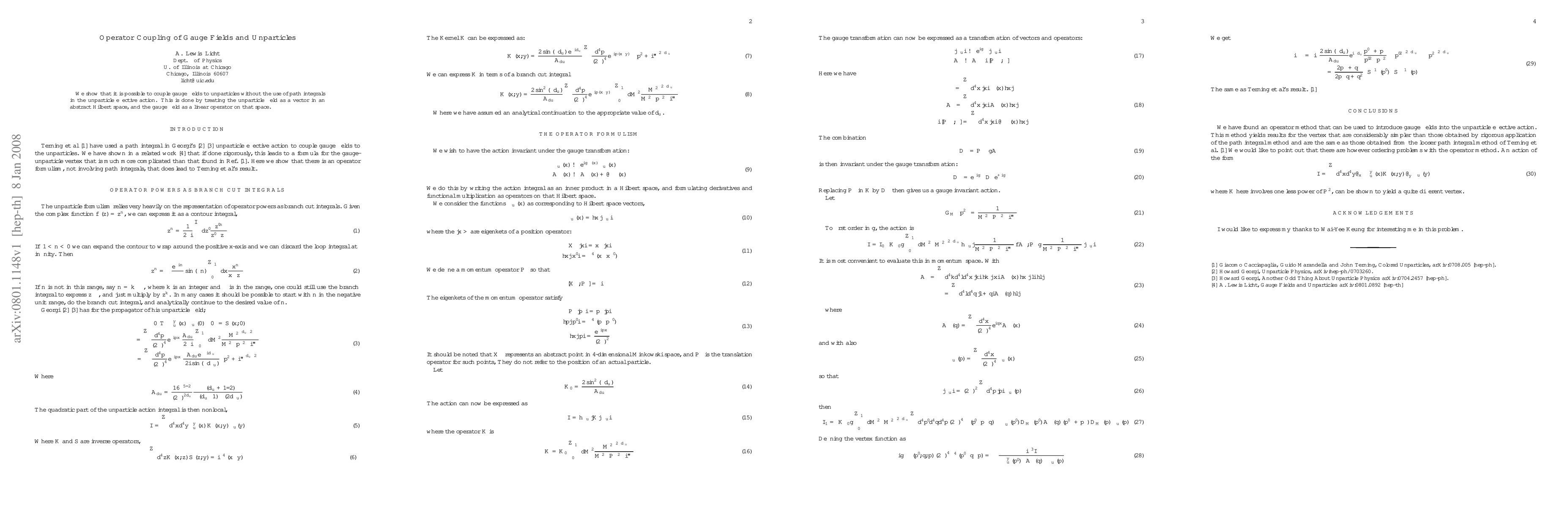 Summary: The paper demonstrates a novel method to couple gauge fields to unparticles by representing the unparticle field in an abstract Hilbert space and treating the gauge field as an operator, thus avoiding path integrals in the unparticle effective action.