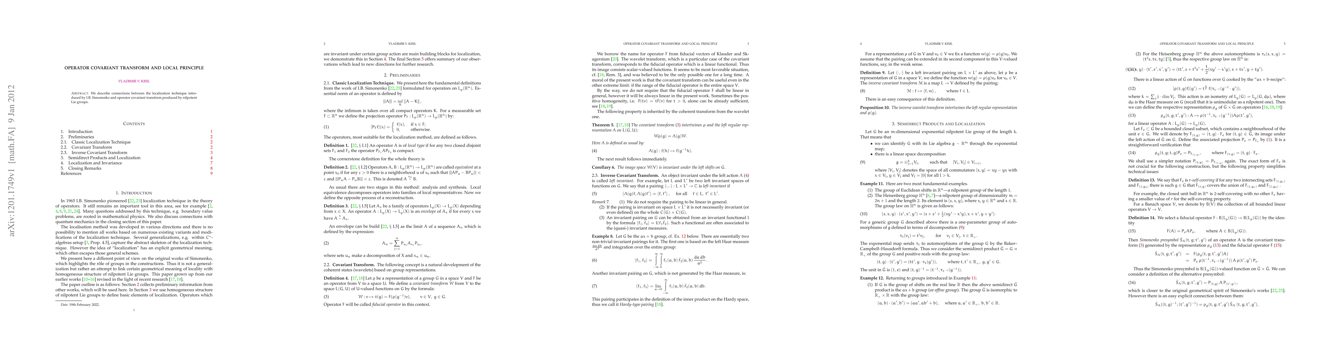 We describe connections between the localization technique introduced by I. B. Simonenko and operator covariant transform produced by nilpotent Lie groups.