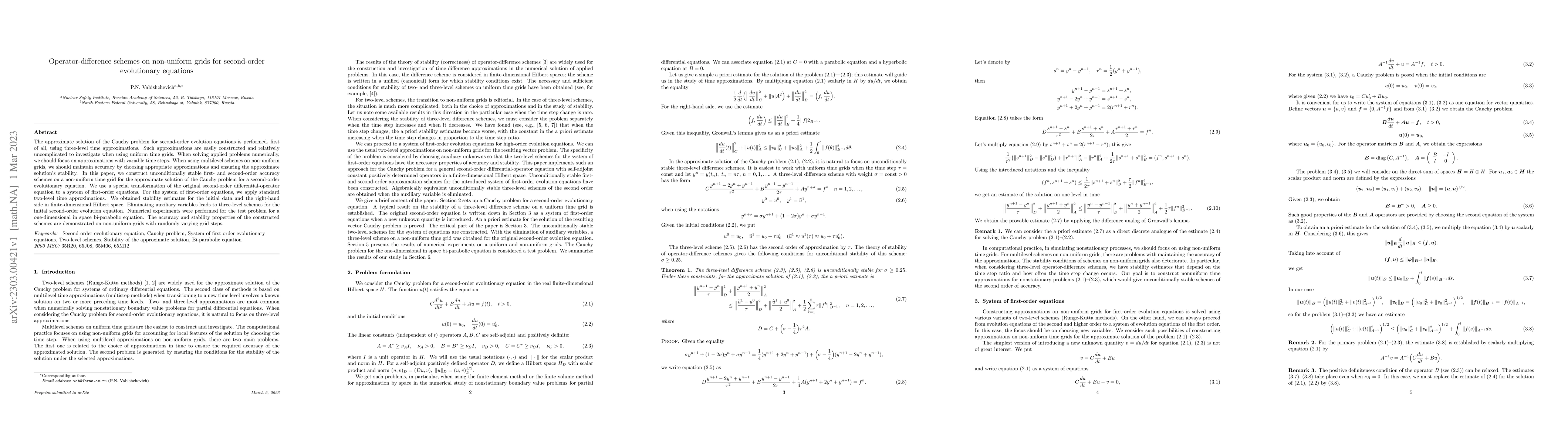 This paper constructs unconditionally stable first- and second-order accurate schemes on non-uniform grids for solving second-order evolutionary equations. The authors transform the second-order equation into a system of first-order equations and apply two-level approximations, demonstrating stability and accuracy through numerical experiments on a bi-parabolic equation.