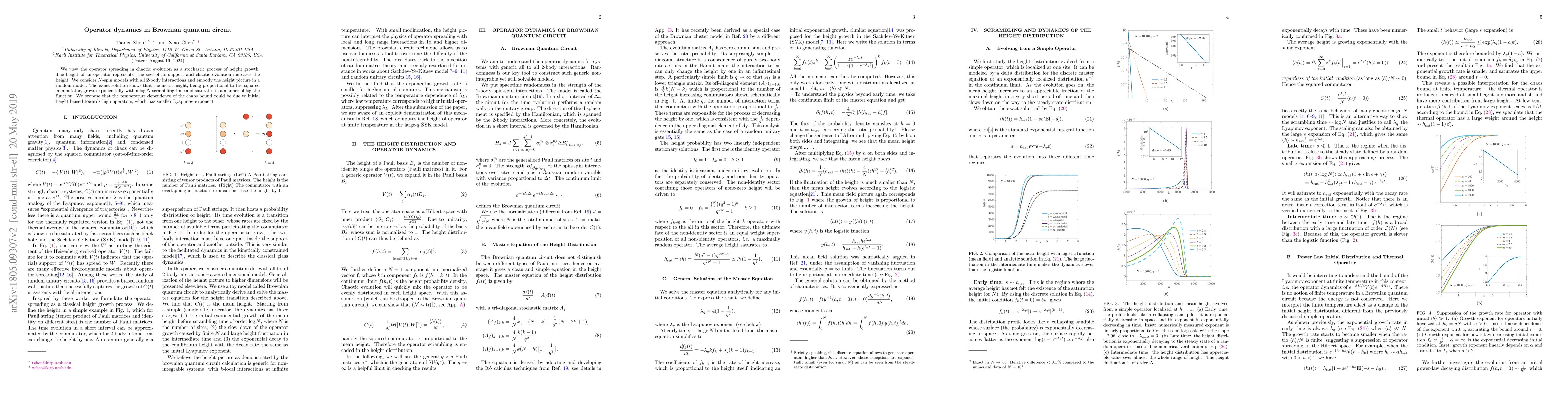 We explore the operator dynamics in a random $N$-spin model with pairwise interactions (Brownian quanum circuit). We introduce the height $h$ of an operator to characterize its spatial extent, and derive the master equation of the height probability distribution. The study of an initial simple operator with $h = 1$ (minimal nonzero height) shows that the mean height, which is proportional to the squared commutator, has an initial exponential growth. It then slows down around the scrambling time $\sim\log N$ and finally saturates to a steady state in a manner similar to the logistic function. The deviation to the logistic function is due to the large fluctuations (order $N$) in the intermediate time. Moreover, we find that the exponential growth rate (quantum Lyapunov exponent) is smaller for initial operator with $\langle h\rangle\gg 1$. Based on this observation, we propose that the chaos bound at finite temperature can be produced by an initial operator whose height distribution is biased towards higher operators. We numerically test the power law initial height distribution $1/h^{\alpha} $ in a Brownian circuit with number of spin $N=10000$ and show that the Lyapunov exponent is linearly constrained by $\alpha$ before reaching the infinite temperature value.